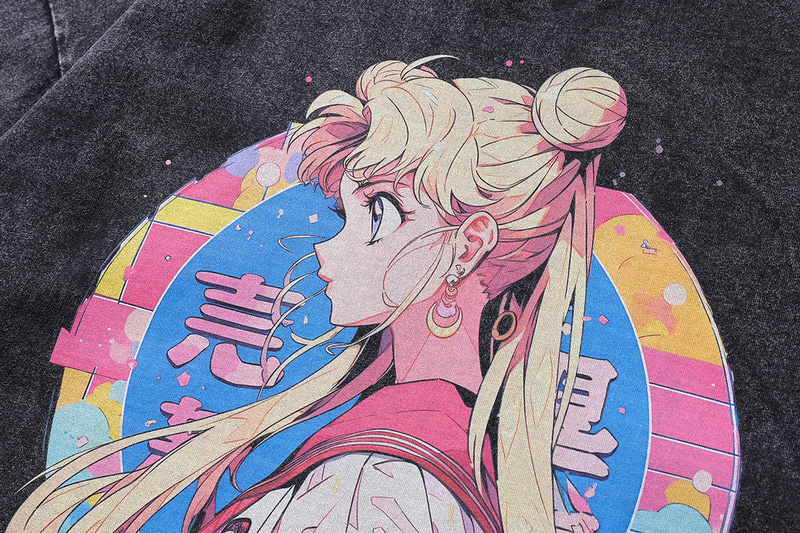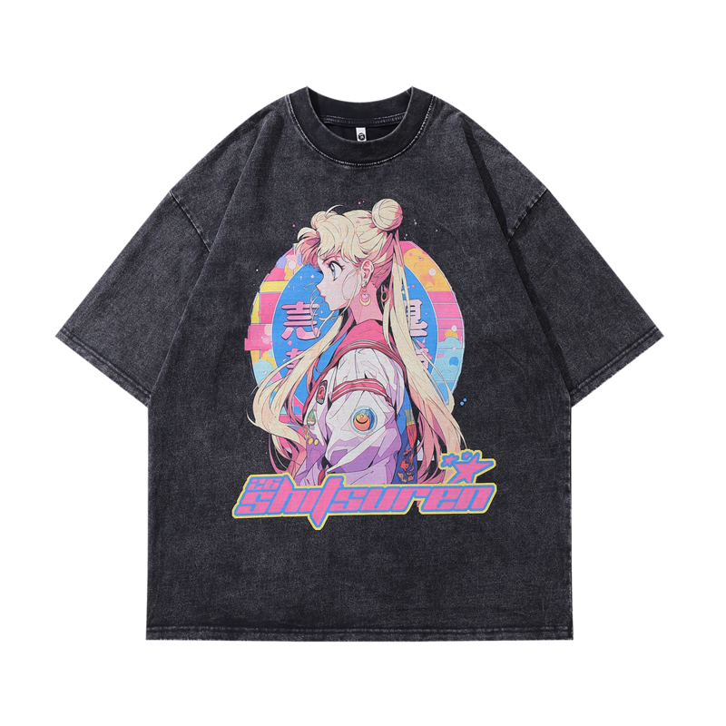 Чёрная футболка TKPA с потертостями и принтом персонажей из аниме