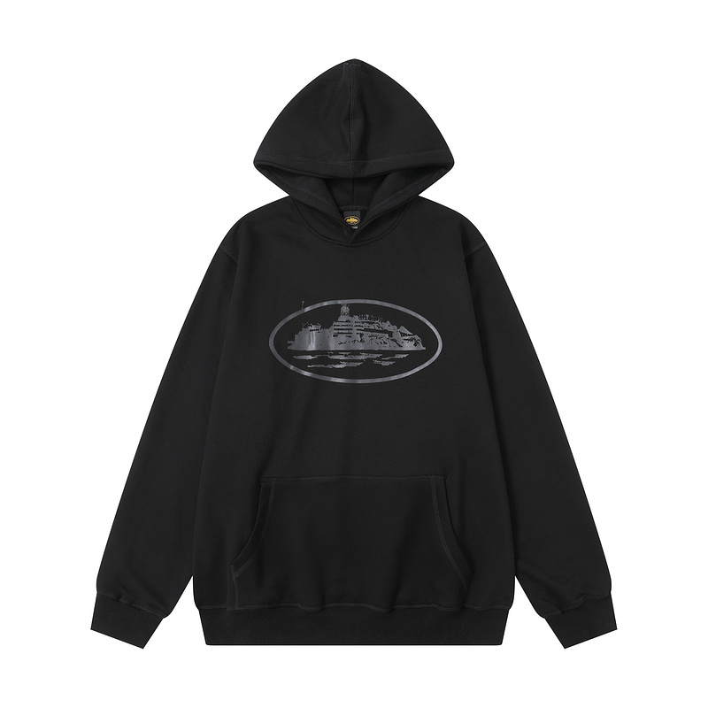 Чёрное с серым принтом от Corteiz утепленное на каждый день худи
