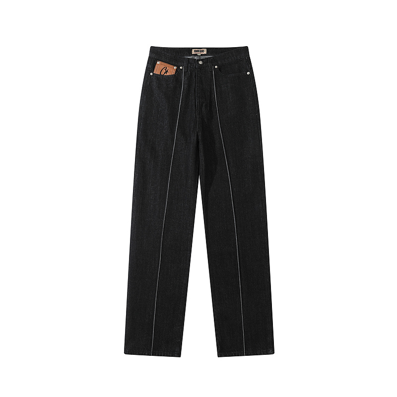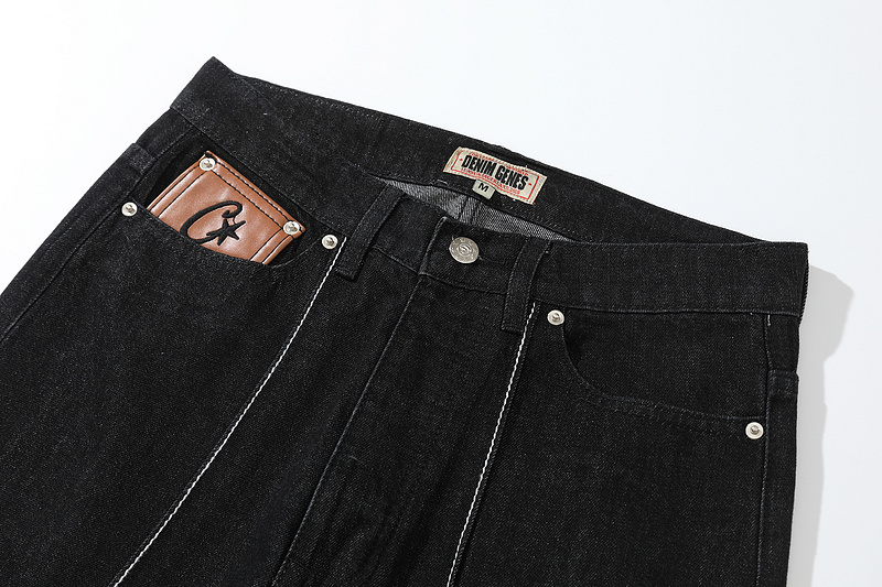 Чёрные джинсы с вышивкой от Corteiz и декоративной строчкой