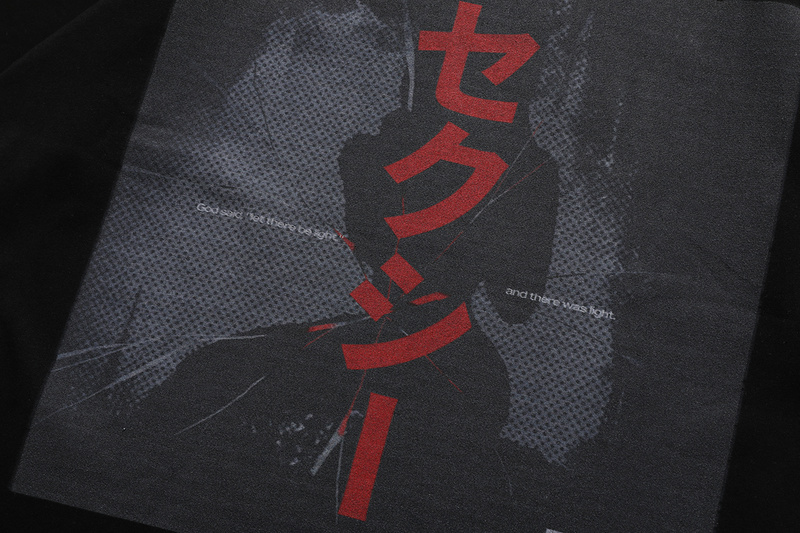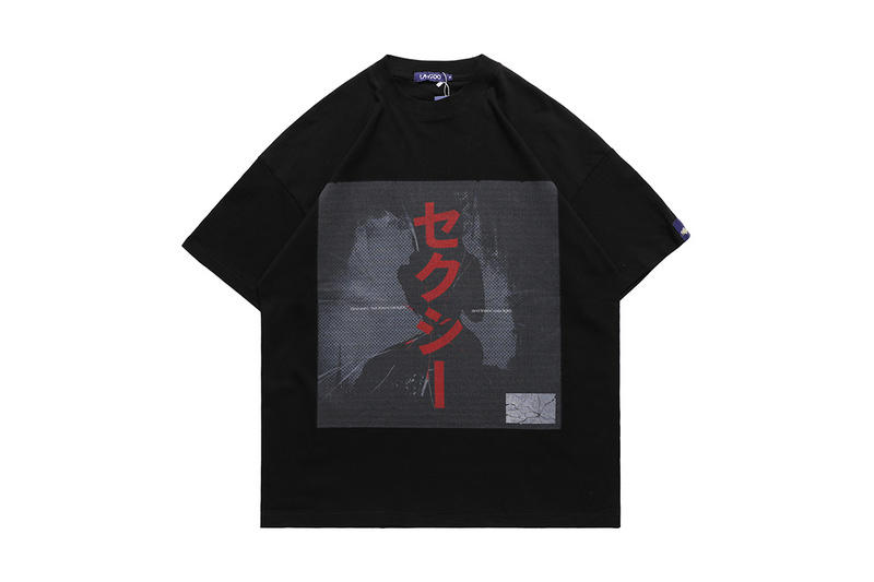 Футболка черного цвета "иероглифы на фоне девушки из аниме"