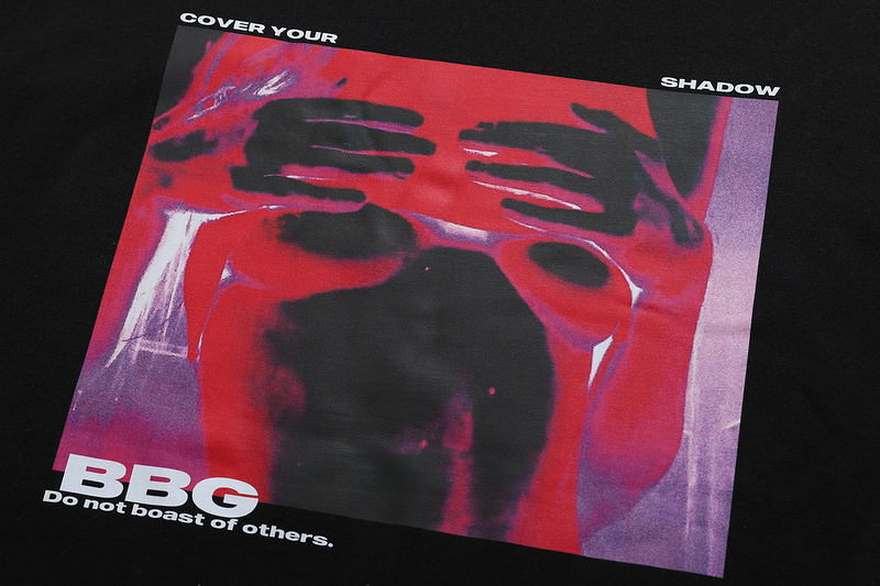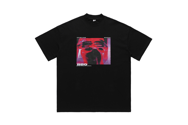 Футболка черного цвета с красным рисунком "прикрывая грудь руками"