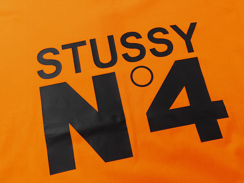 Футболка оранжевого цвета STUSSY с большим черным лого и принтом "№4"