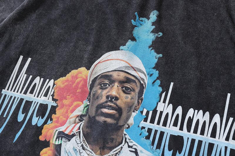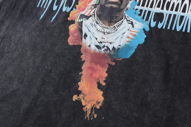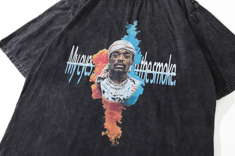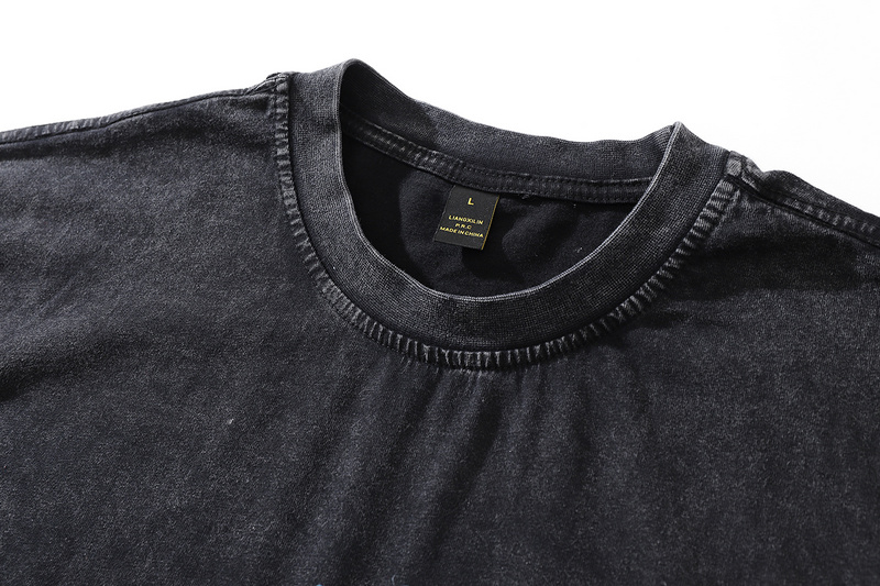Чёрная футболка с принтом ТКРА имеет круглый вырез и свободный крой