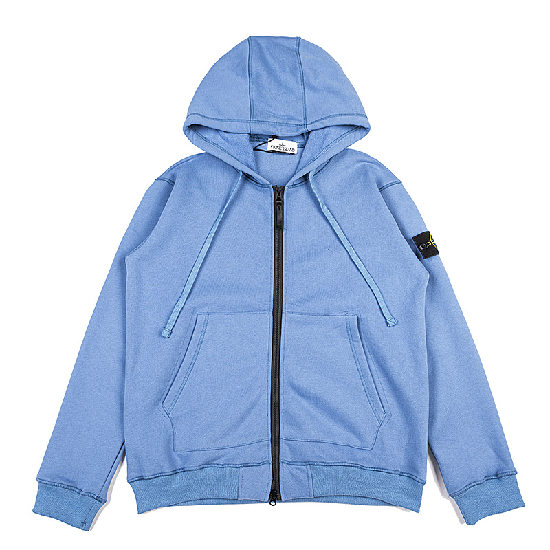 Голубое Stone Island зип-худи с фирменной нашивкой на рукаве