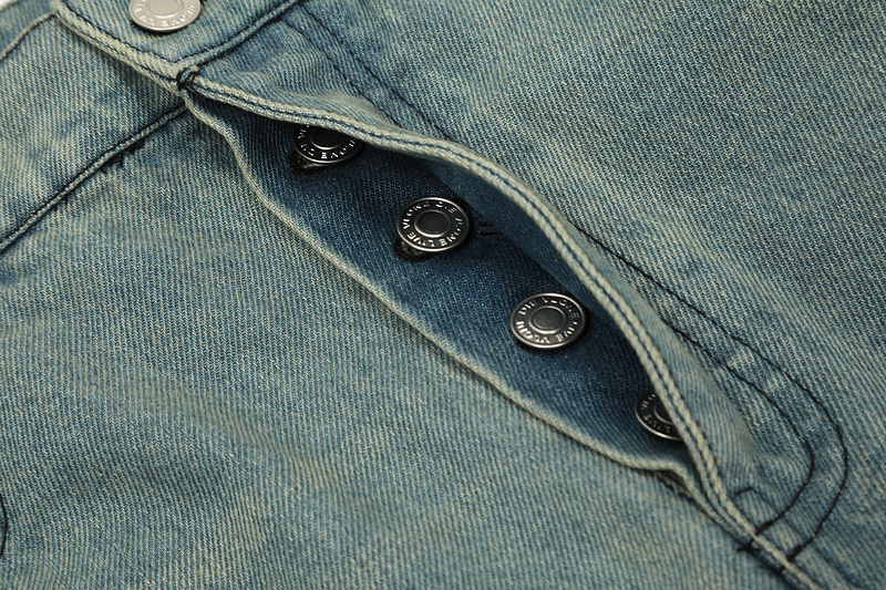 Голубые джинсы от бренда VLONE с желтой надписью спереди