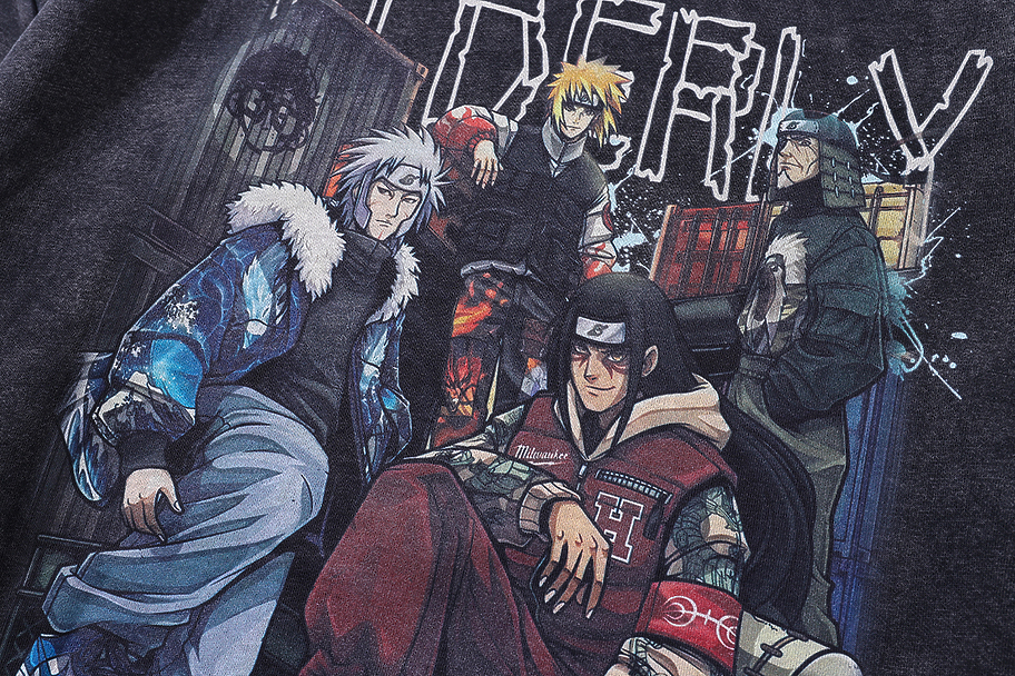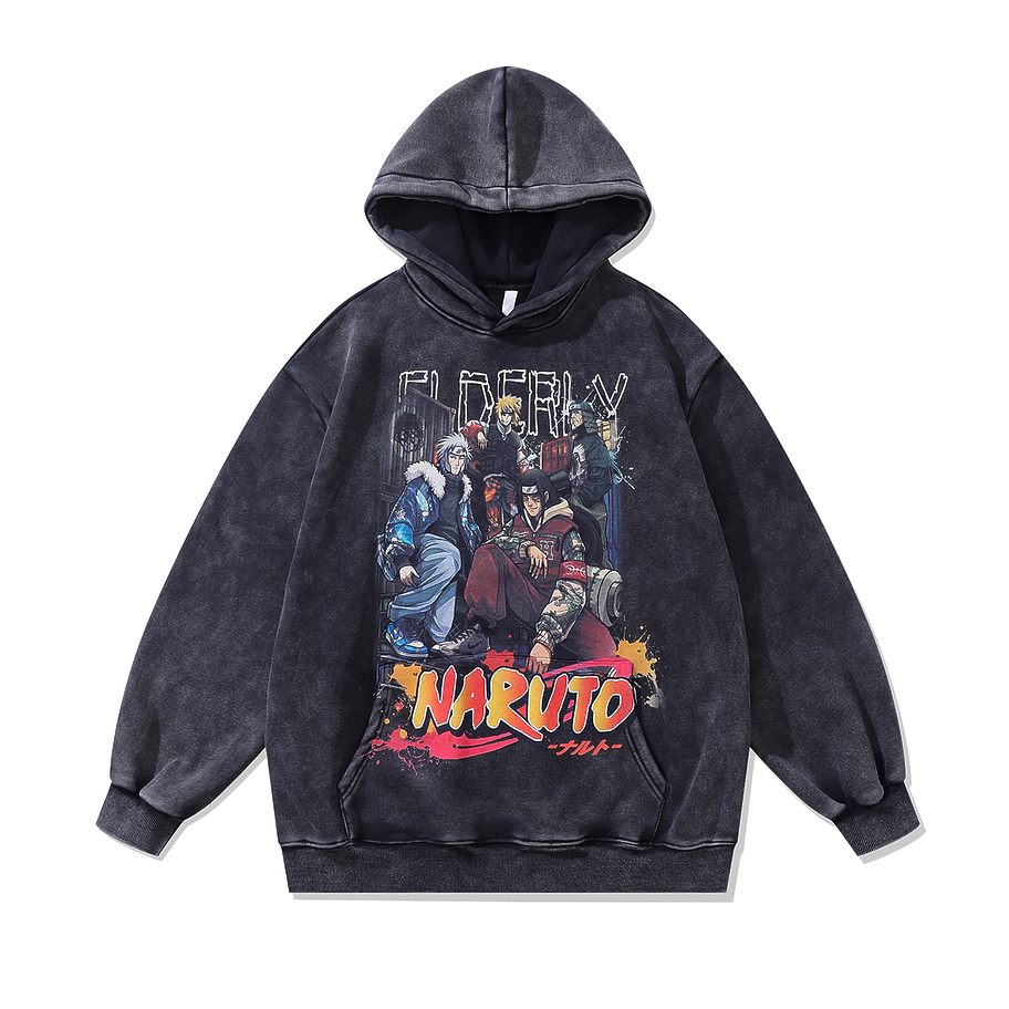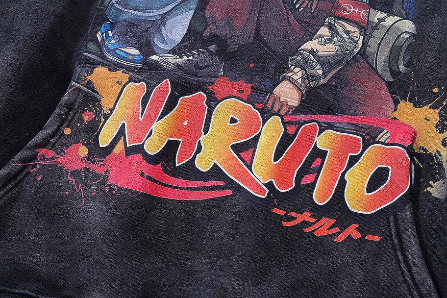 Выстиранное черное худи TKPA с крупным принтом героев аниме Naruto