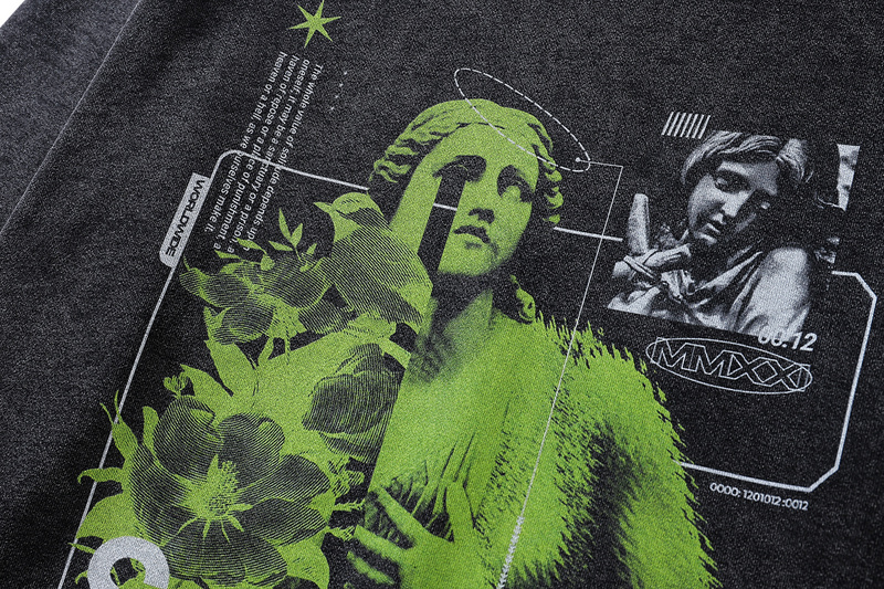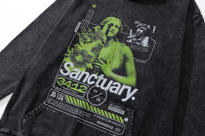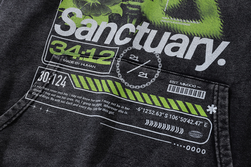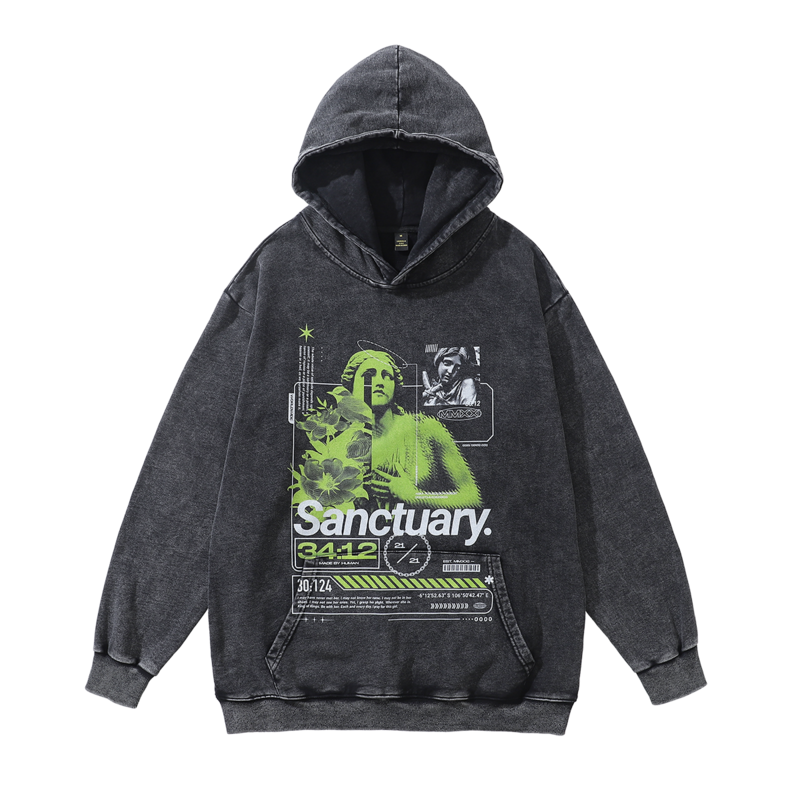 Черное худи бренда TKPA с абстрактным рисунком и надписью Sanctuary