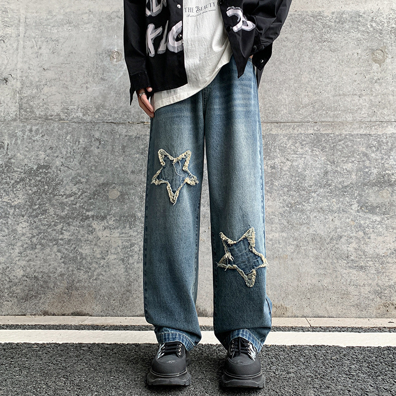 Клёш Locketomy джинсы синие с вышитыми звёздами и бахромой