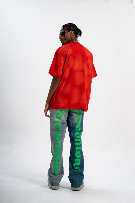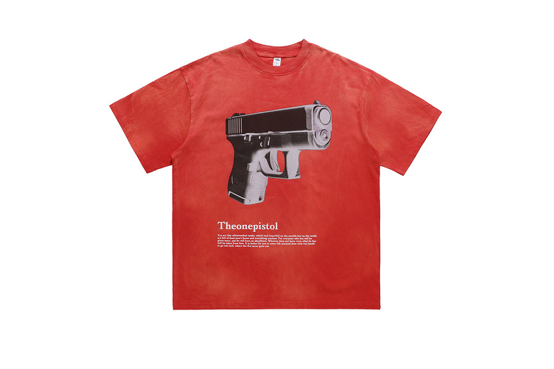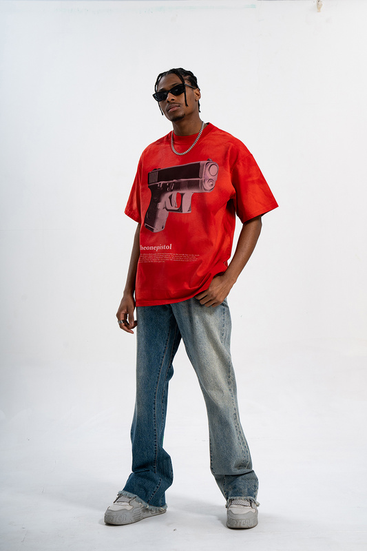 Красная футболка с принтом "Theonepistol с большим пистолетом"