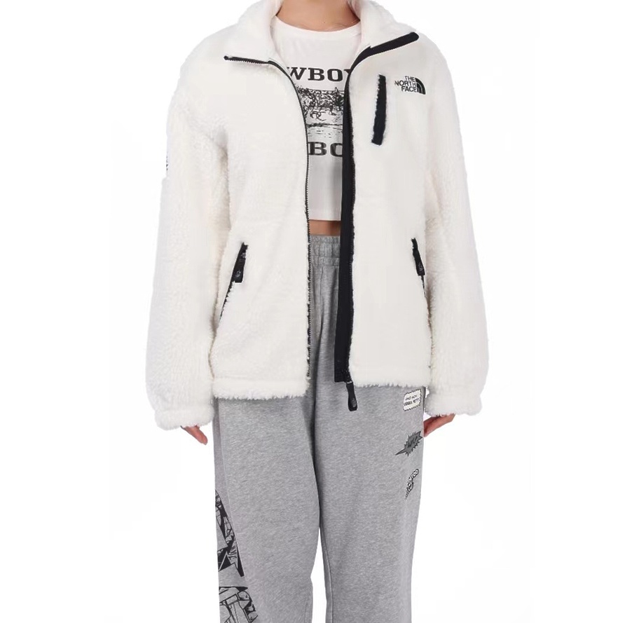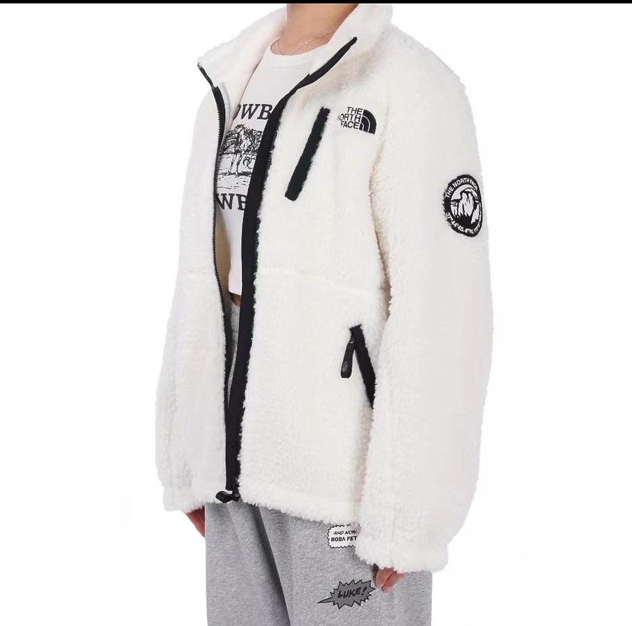 Куртка шерпа белая с вышивкой бренда на груди и рукаве The North Face