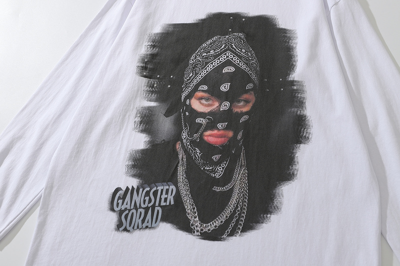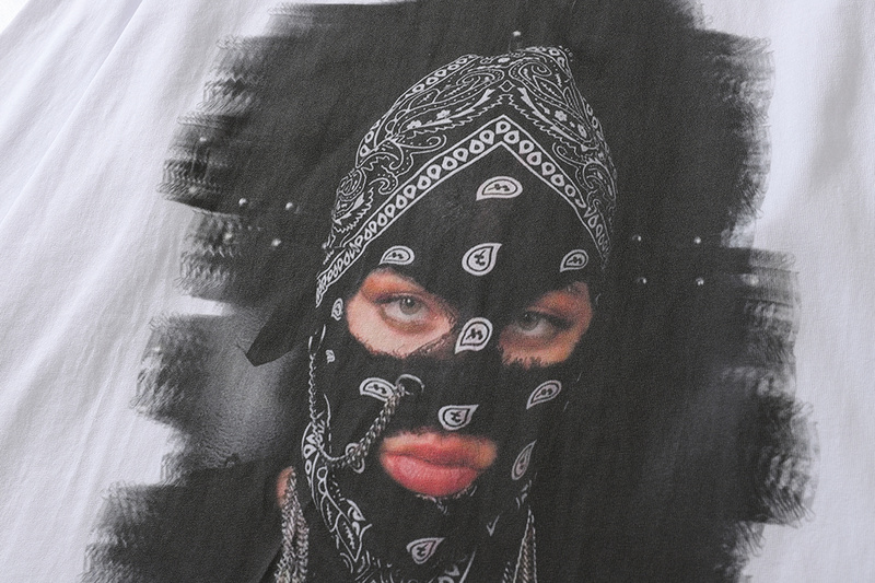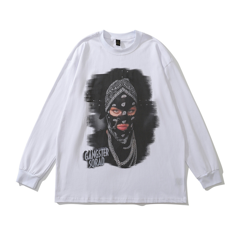 Белый хлопковый лонгслив бренда TKPA с принтом женщины в балаклаве