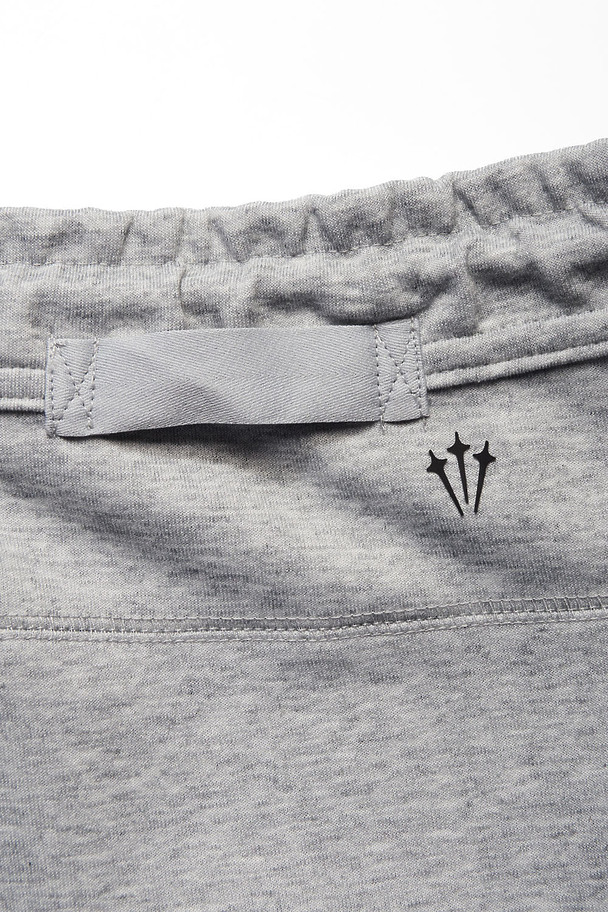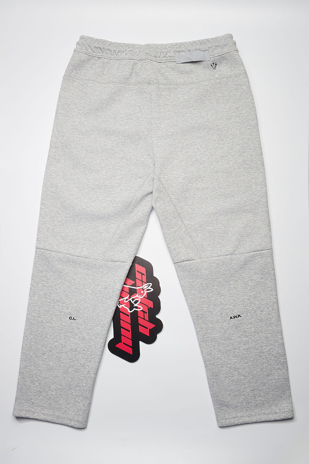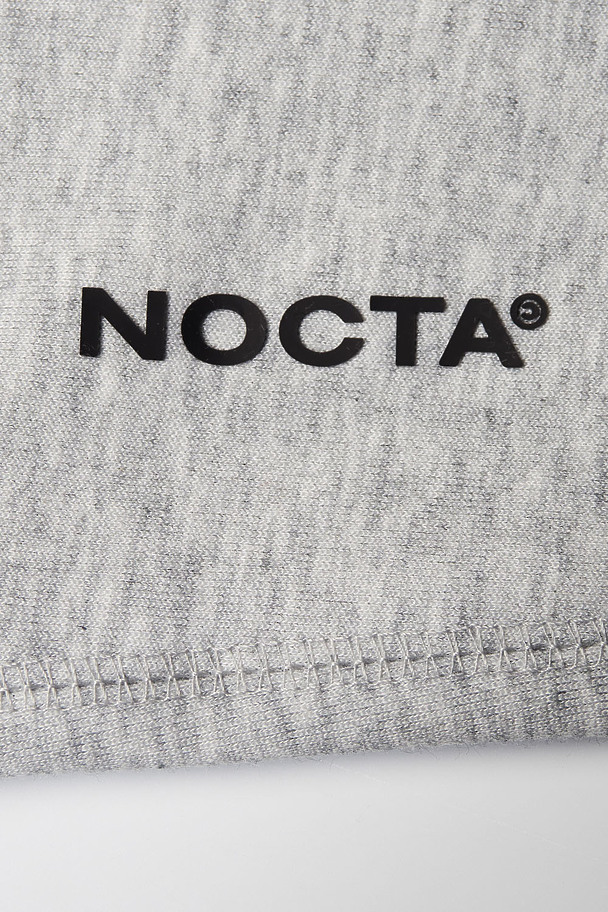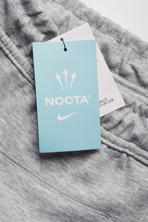 Серые спортивные штаны Nike Nocta в наличии. Плотный трикотаж с мягкой внутренней поверхностью. Оттенок холодный, ровный, без бликов. Крой прямой, сужение к щиколотке за счёт эластичных манжет. Пояс на широкой резинке, дополнен утягивающим шнуром в тон. Логотипы Nike и Nocta — на левой штанине и сзади, чуть выше колена. Посадка средняя, свобода движения сохраняется по всей длине.