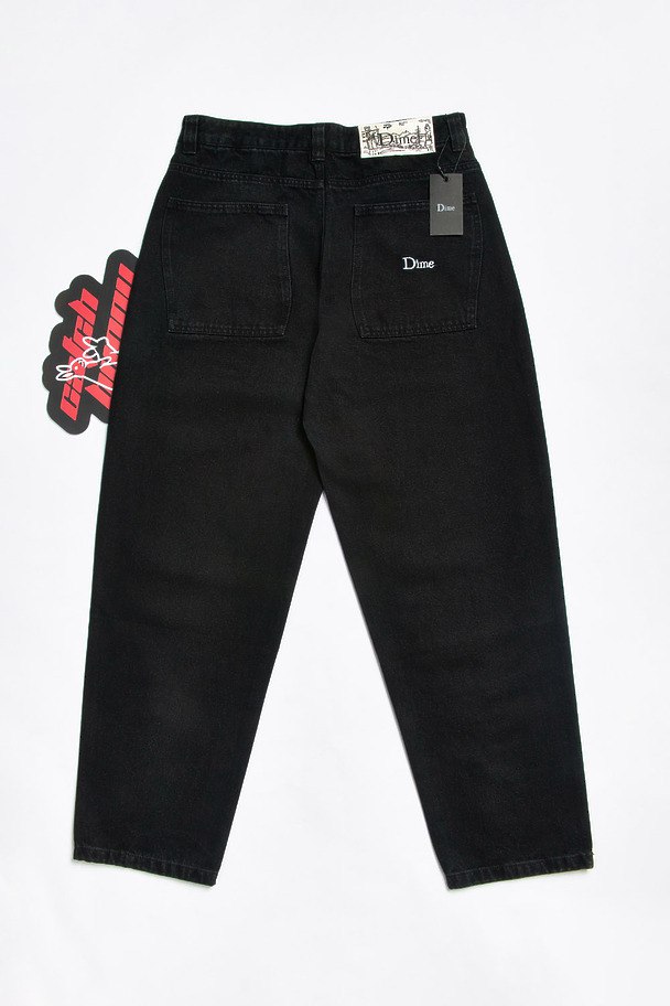 Джинсы Dime с вышитым лого чёрного цвета в наличии — прямой крой, плотный деним с матовой поверхностью. Ткань тёмная, равномерная, без бликов и выцветаний. Логотип вышит тонкой линией, расположен на заднем кармане, слегка смещён вбок. Посадка средняя, пояс со шлёвками, застёжка — молния и металлическая пуговица. Края без потертостей, силуэт чистый, без декоративных элементов.