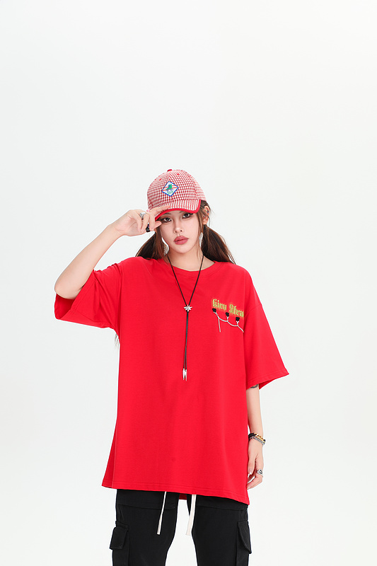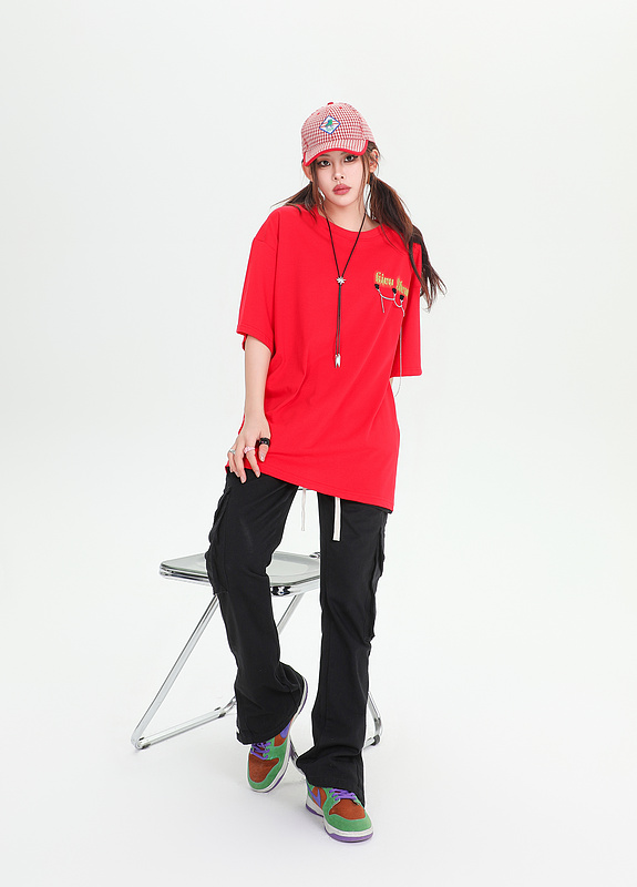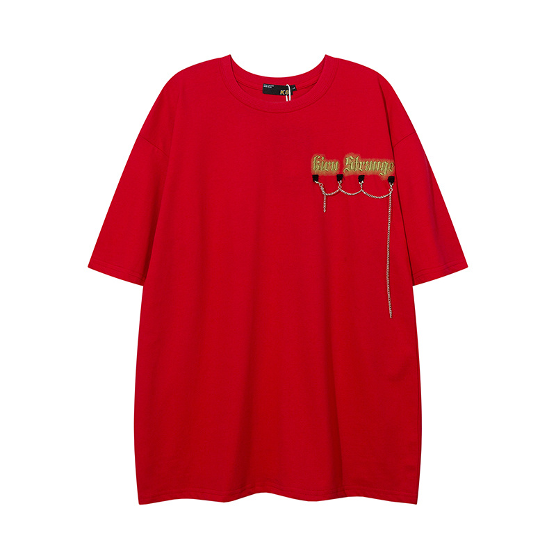 Насыщено-красная футболка от бренда KIRIN STRANGE с цепью на груди