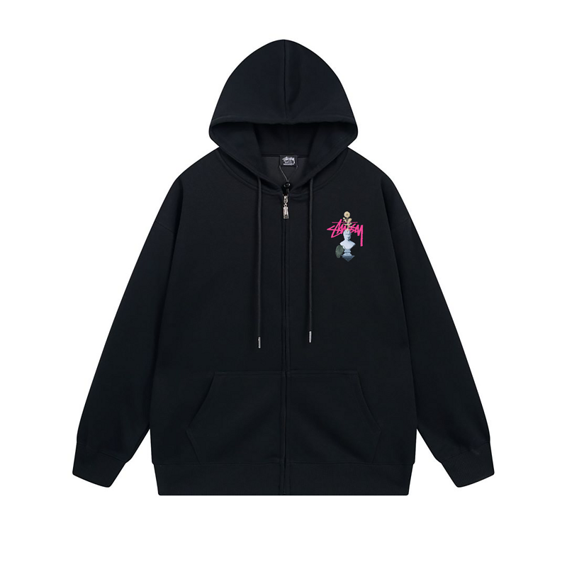 Полностью черное Stussy с логотипом и принтом зип худи