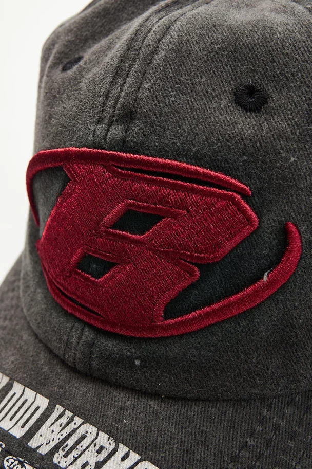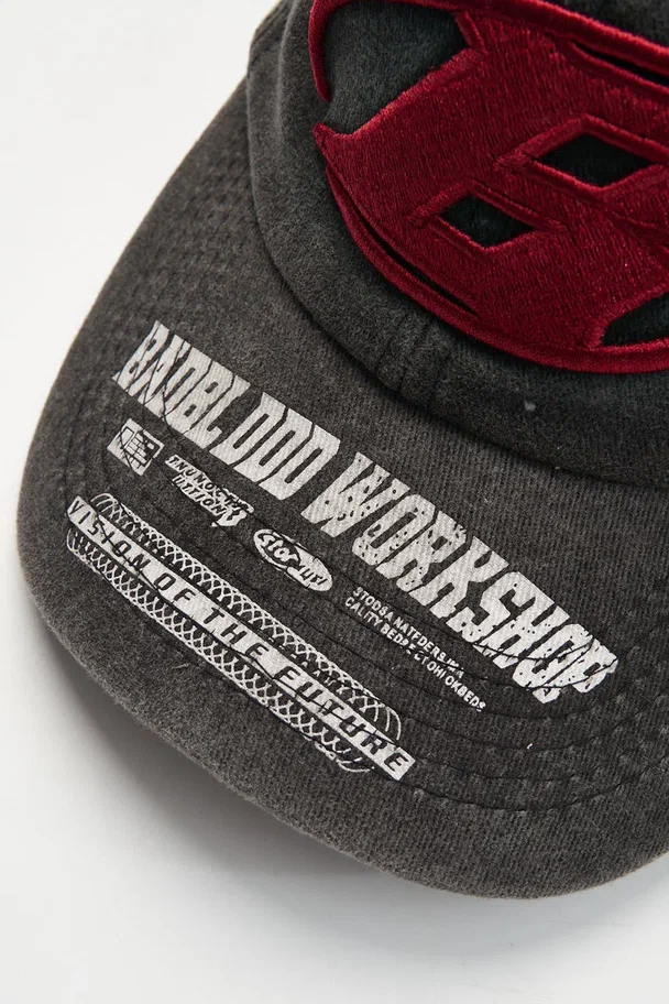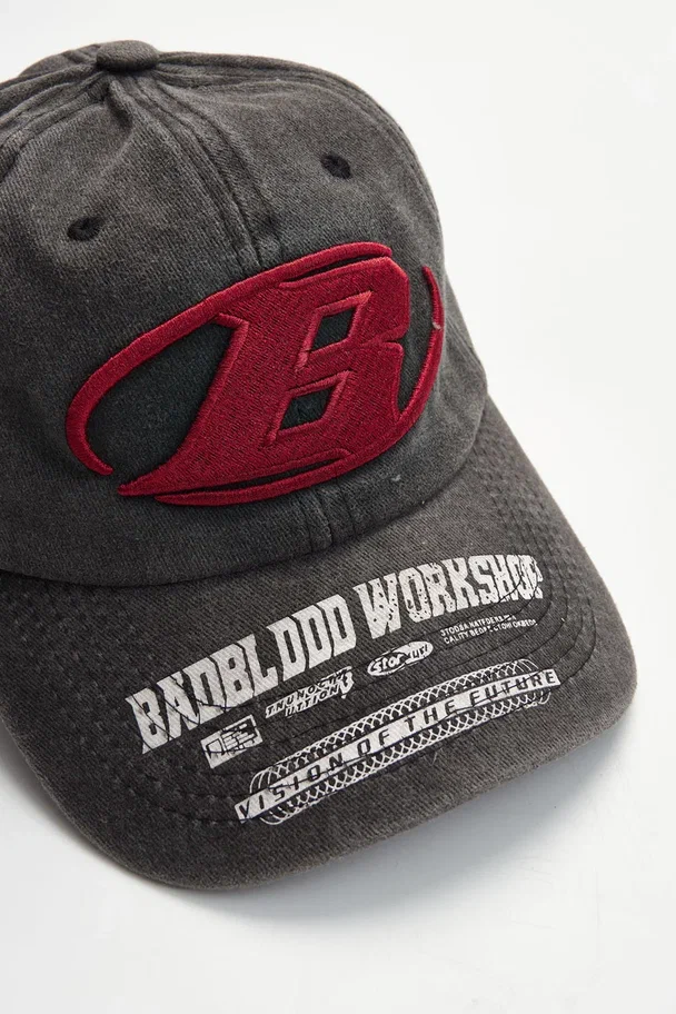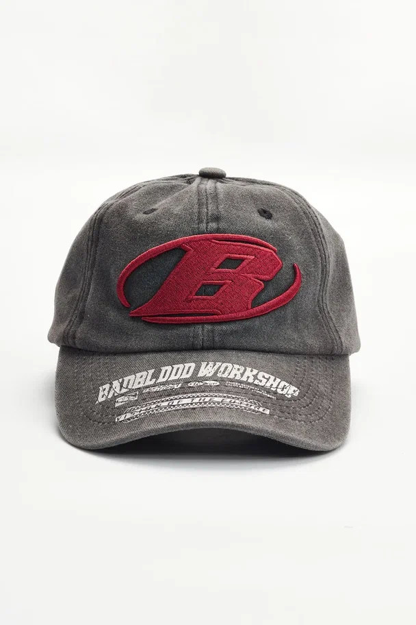 Кепка Badblood Workshop — агрессивный стритвир с олдскульным вайбом. Модель выполнена из плотного варёного денима с эффектом винтажного выцветания. Объёмная вышивка с красной литерой B и изогнутый козырёк с фирменным принтом придают кепке спортивный, но дерзкий характер. Настрой — будто пришёл с трэш-парку или ускользнул с питлейна дрифт-ивента.