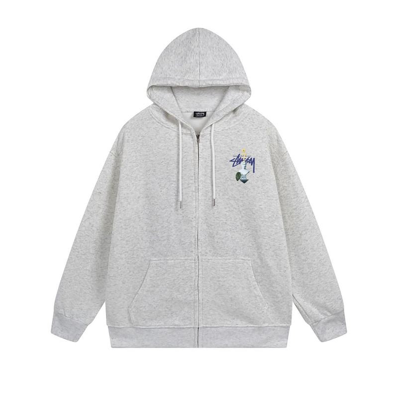 Повседневное бренда Stussy зип худи светло-серое с рисунком на спине