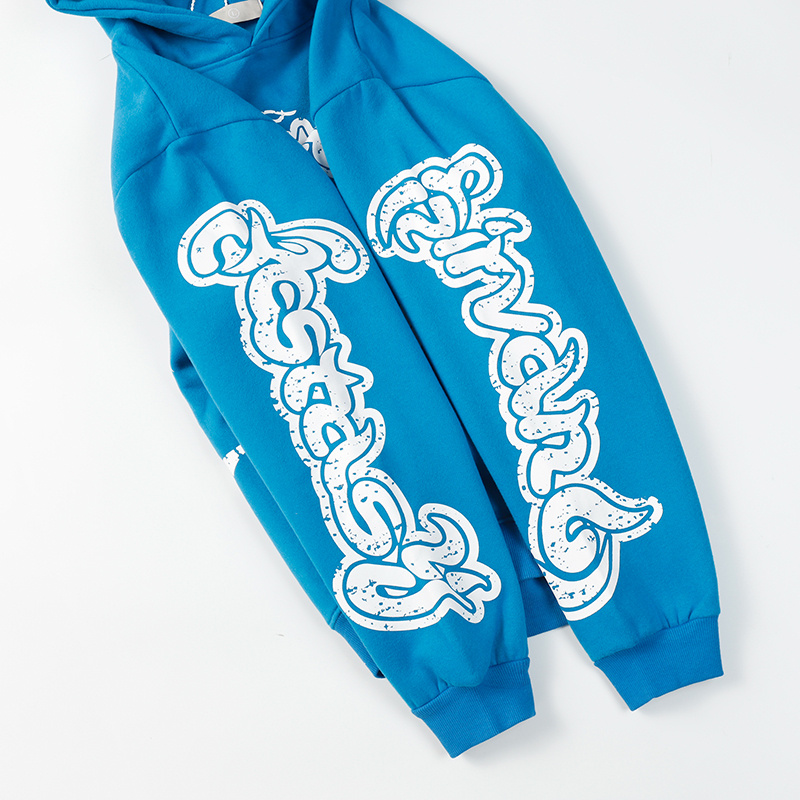 С карманом кенгуру и белой печатью светло-синее худи Broken Planet