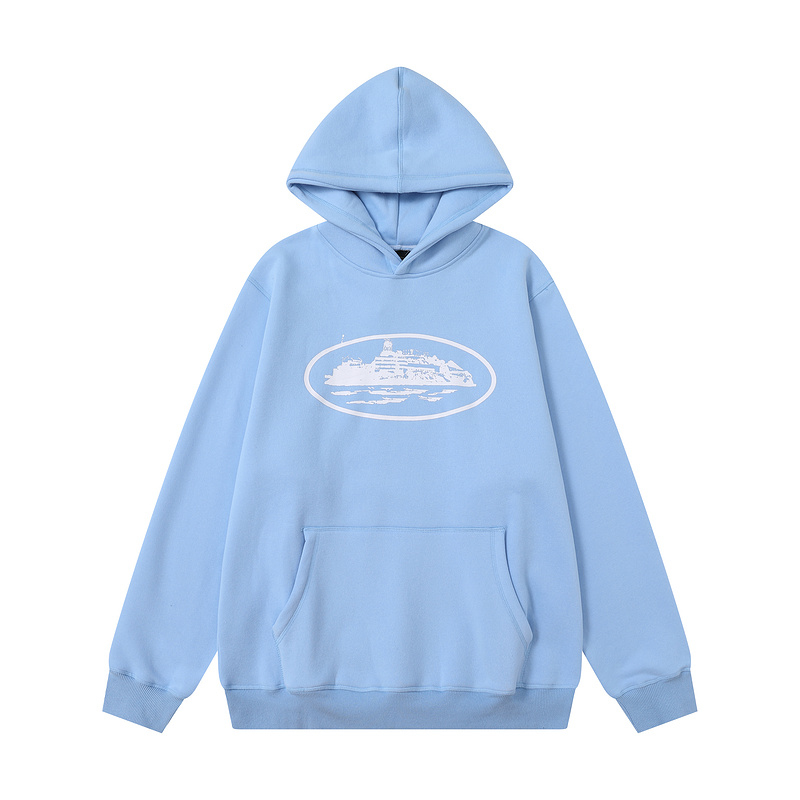 С объёмным капюшоном голубое утепленное худи с эмблемой Corteiz