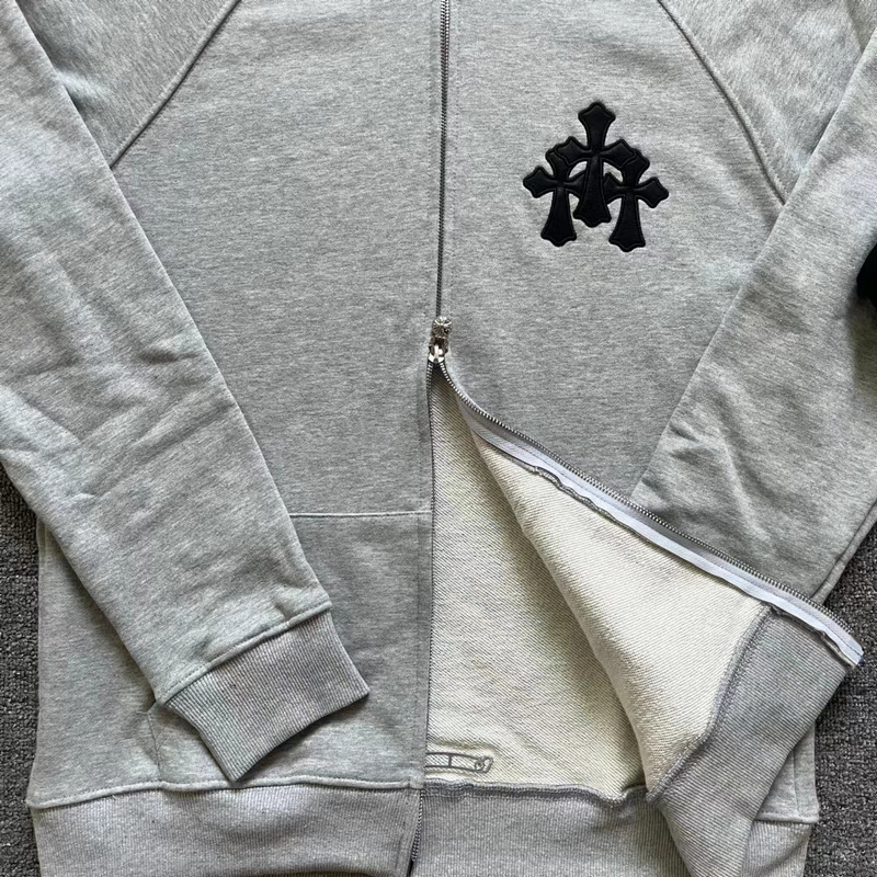 Серое Chrome Hearts зип худи с объёмным капюшоном и нашитыми крестами
