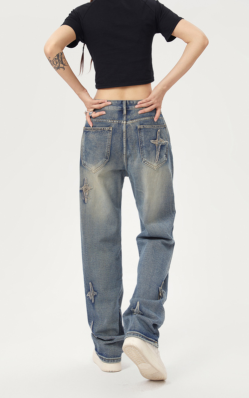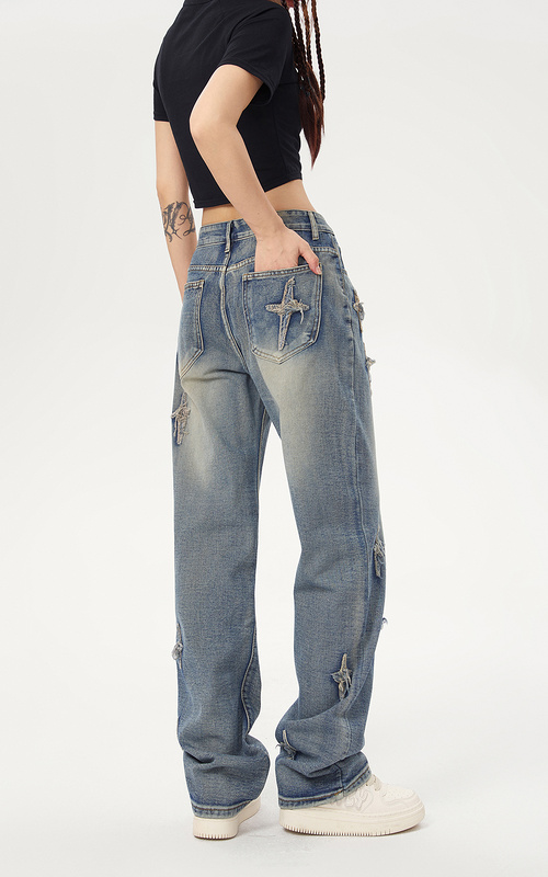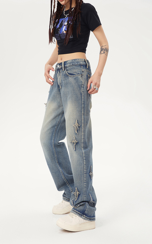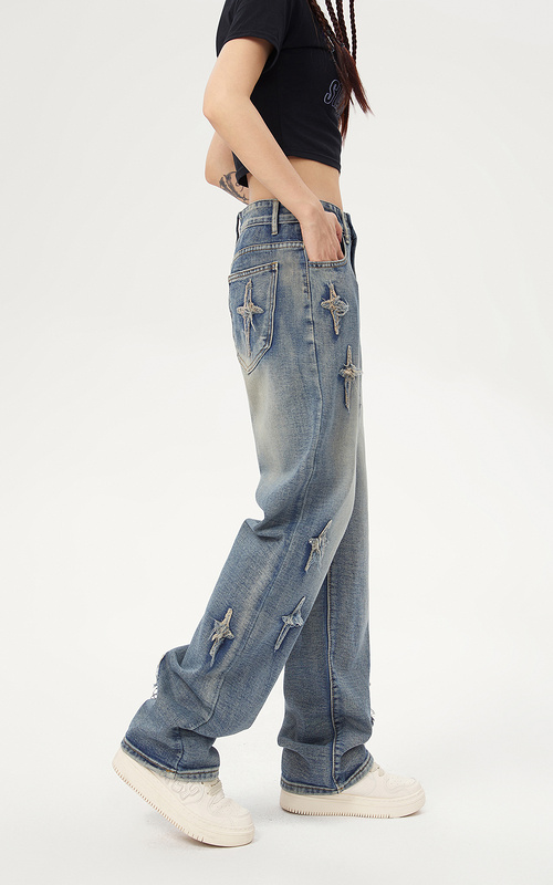Широкие синие джинсы DYCN с нашитыми звездами спереди