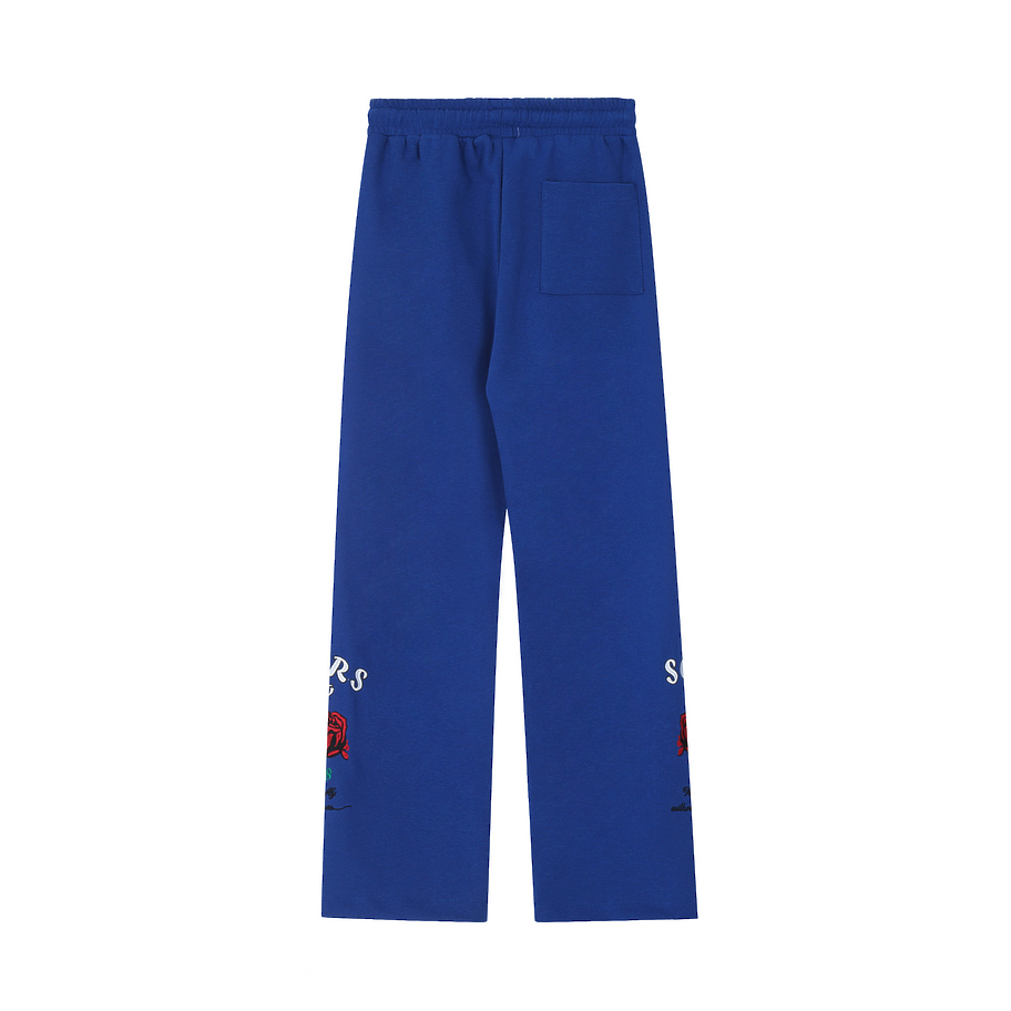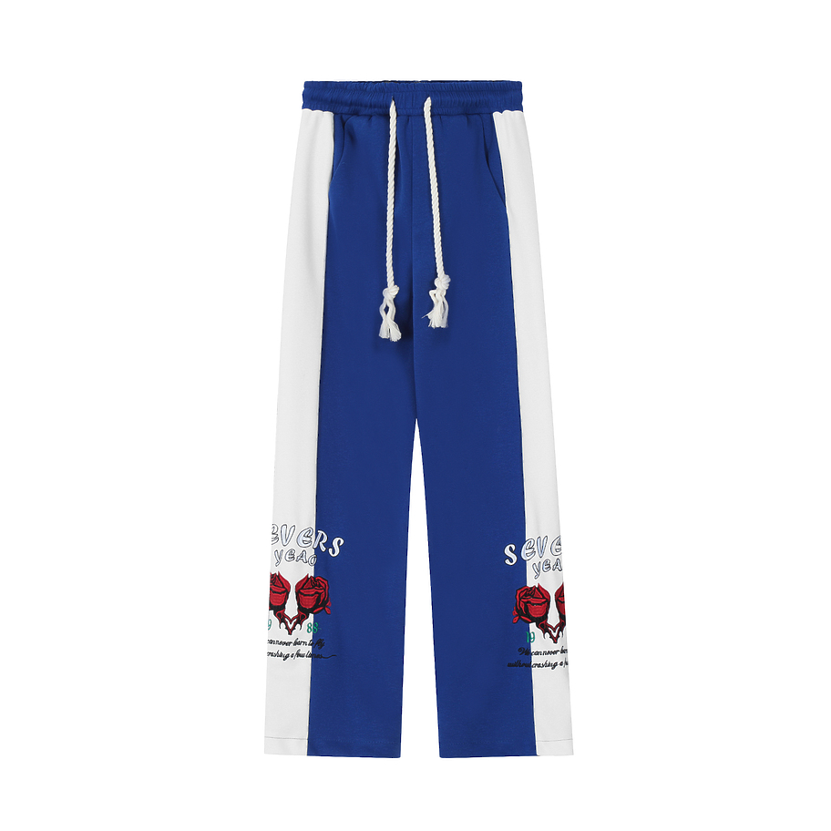 Синие штаны SEVERS с белыми лампасами и вышитыми красными розами