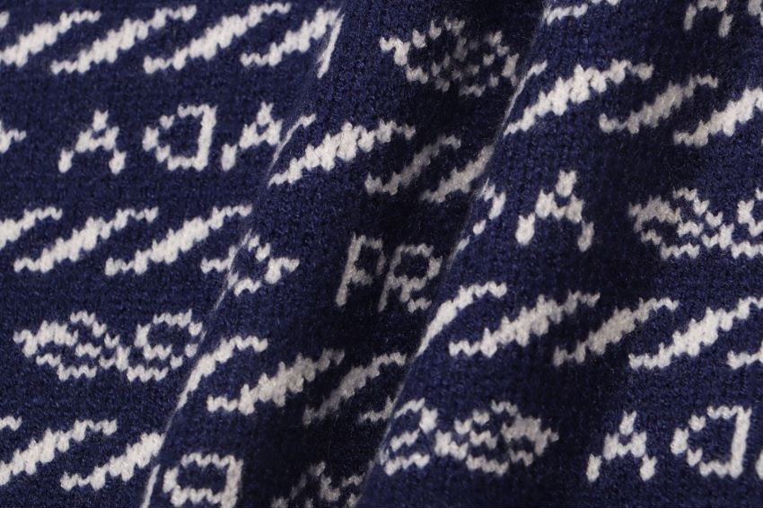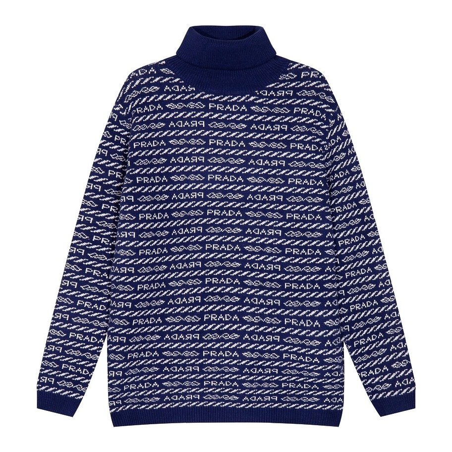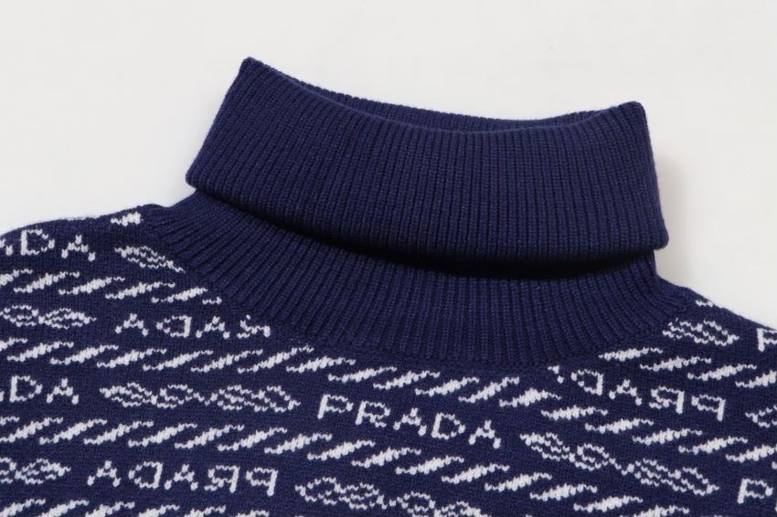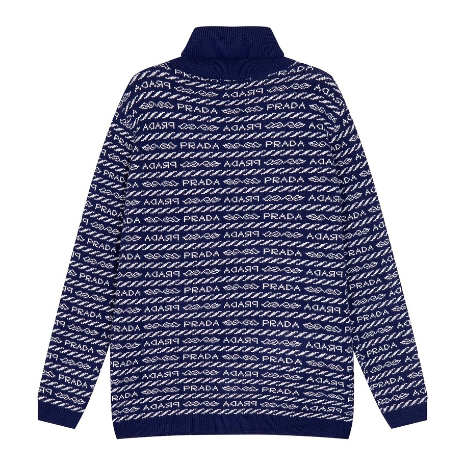 Синий свитер Prada с высокой горловиной и лого по всей поверхности