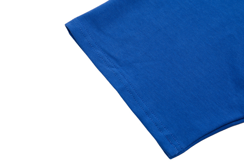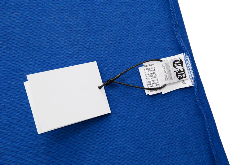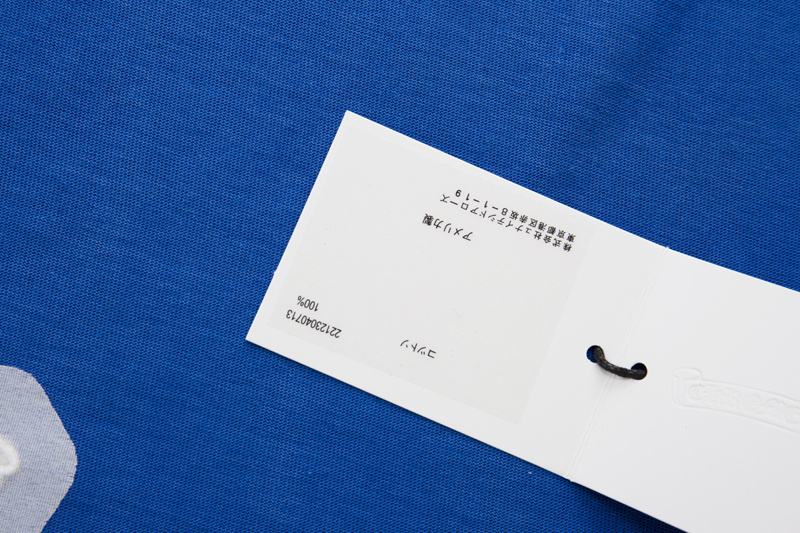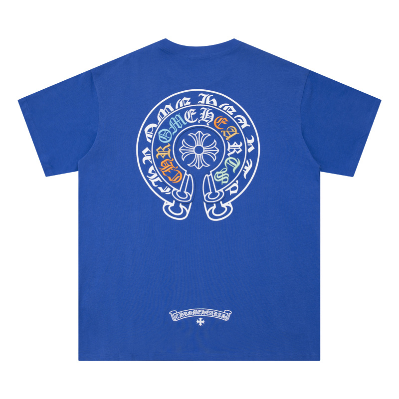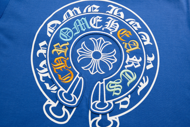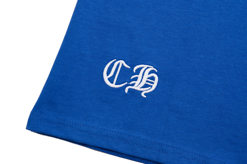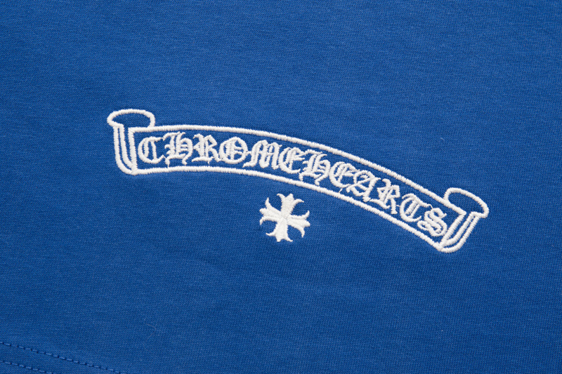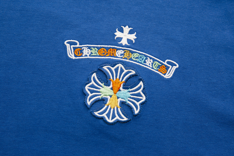 Синяя яркая футболка от Chrome Hearts со спущенной линией плеча