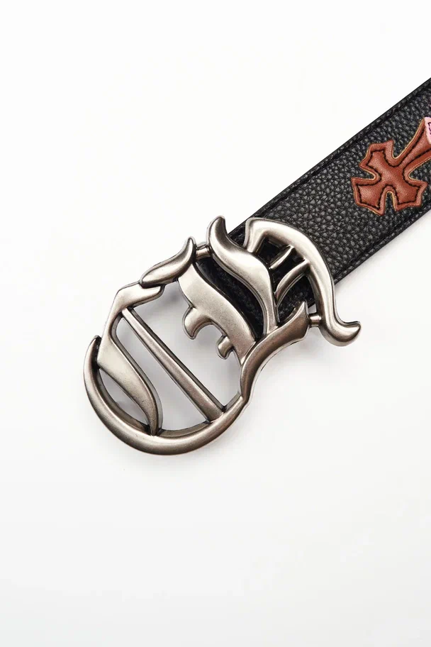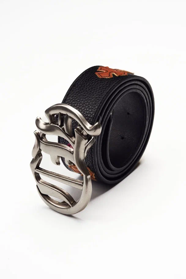 Чёрный ремень в стиле Chrome Hearts — ультимативный элемент образа с акцентом на luxury streetwear и west coast эстетику. Полотно из плотной текстурированной экокожи украшено объёмными крестами в кислотных оттенках и брендовыми отсылками. Центральная деталь — массивная пряжка в форме готических инициалов, выполненная из полированного металла с характерной тяжестью.