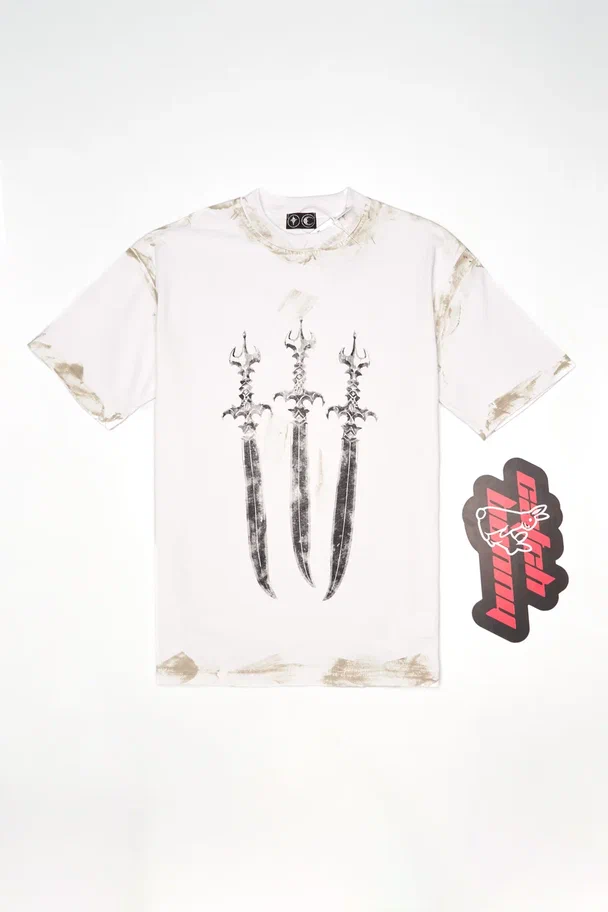 Футболка белая Thug Club 3knife. Цвет яркий, без желтизны. Хлопок плотный, с гладкой текстурой. Крой прямой, плечо чуть опущено. Горловина укреплена, кант двойной, без скручивания. На груди графика — три ножа, прорисовка чёткая, без размытости. Поверхность принта гладкая, без трещин. Рукав удлинённый, посадка свободная. Длина стандартная, подол ровный.