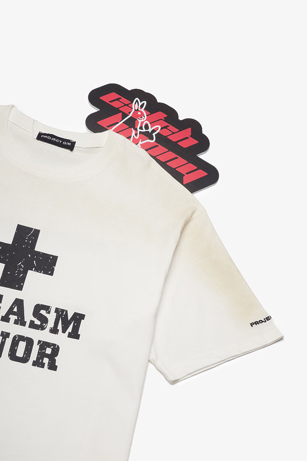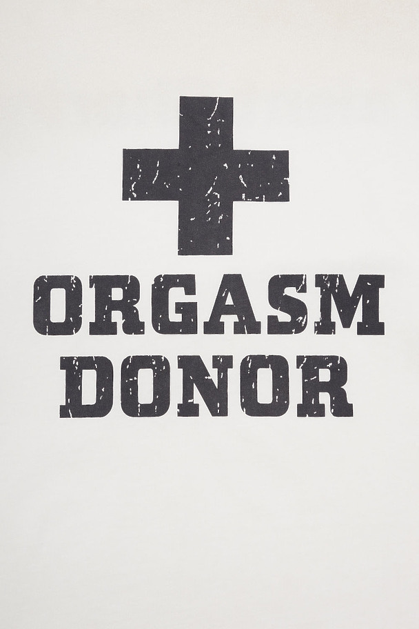 Белая футболка Project G/R — не про скромность. Прямое послание ORGASM DONOR с чёрным крестом на груди — провокация, поданная в эстетике военной формы, street sex-positive культуры и панковской иронии. Текст нанесён крупным шрифтом, напоминающим армейский или медицинский, а художественные мазки по всей поверхности добавляют эффект raw energy.