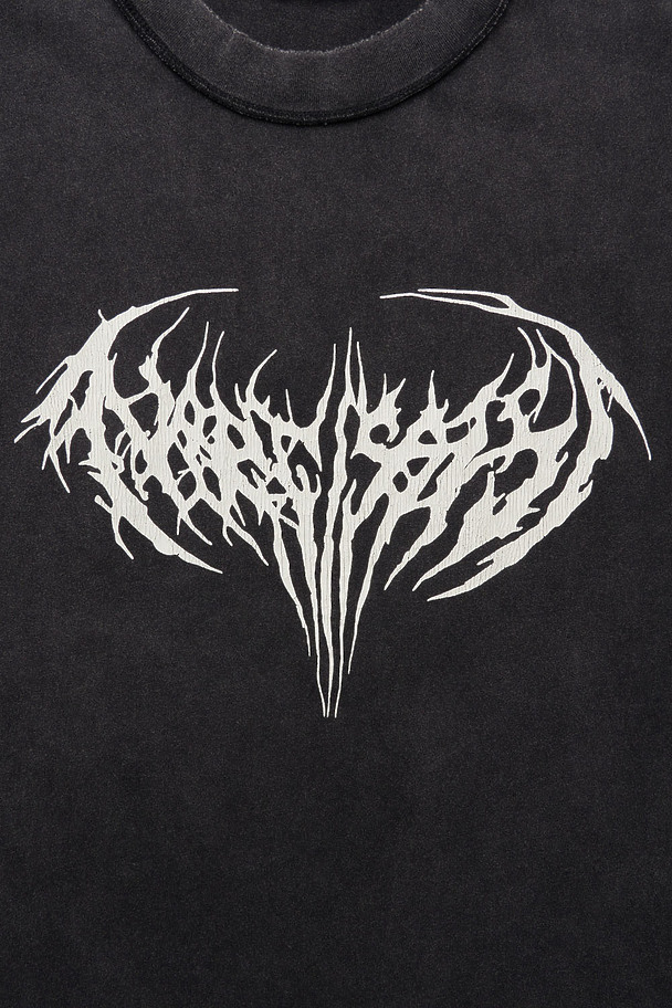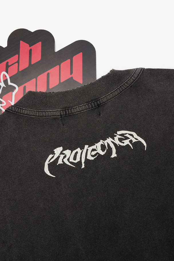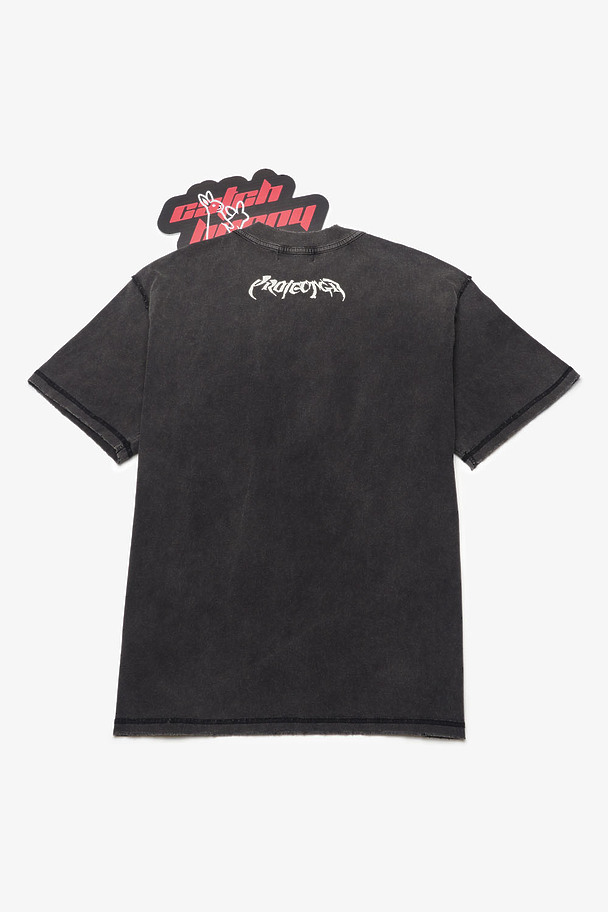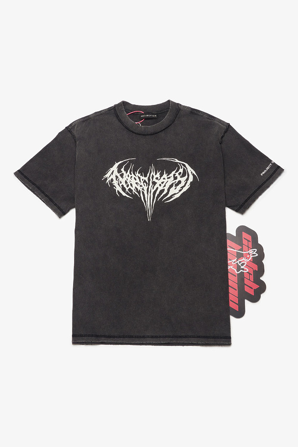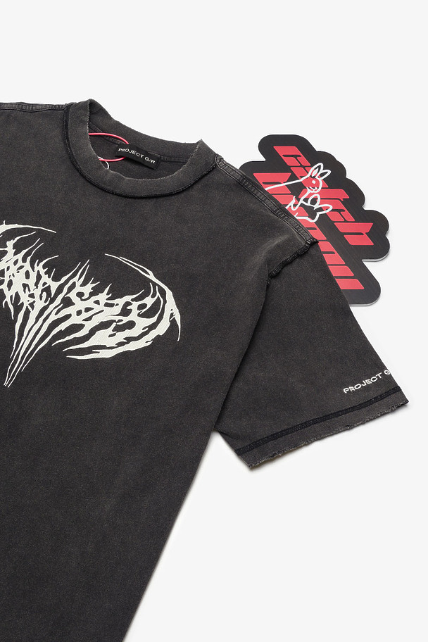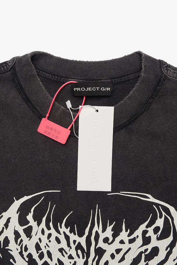 Тёмно-серая футболка Project G/R — манифест для тех, кто говорит через графику. Центральный принт напоминает лого блэк-метал-групп: агрессивный, хаотичный, почти нечитаемый — и в этом вся суть. Это не просто надпись, это визуальный протест, зашифрованный в эстетике тьмы.