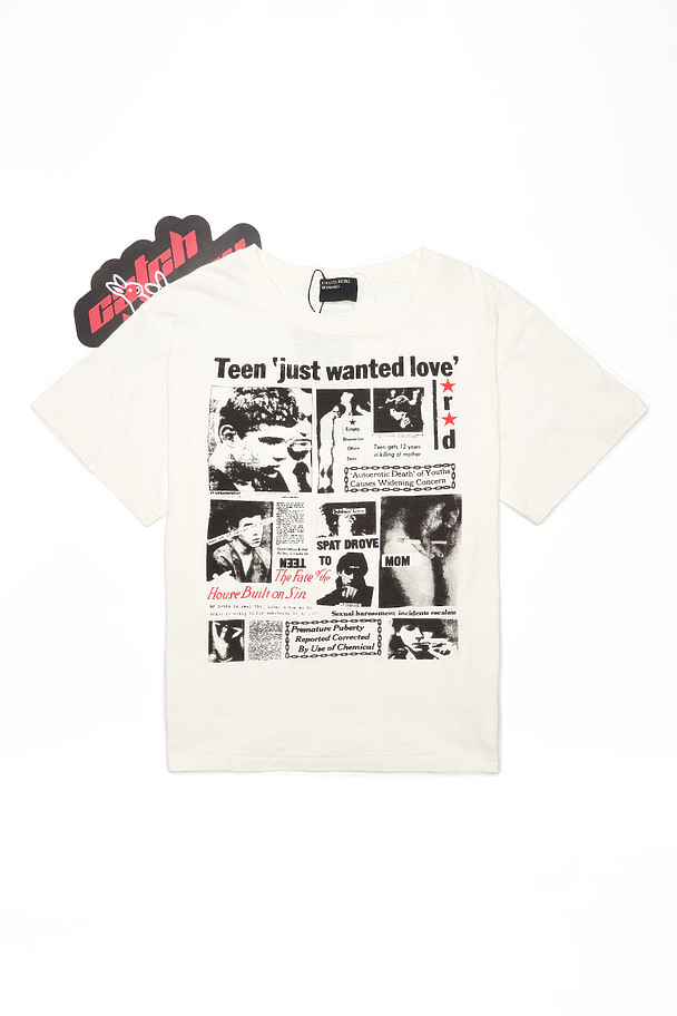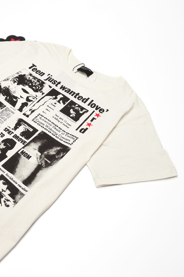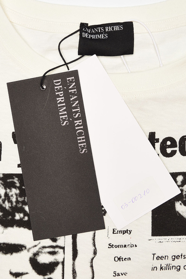 Футболка Enfants Riches Déprimés — визуальный манифест постпанк-депрессии и американской тревожности. На груди — коллаж из газетных вырезок в стиле таблоидов 70–80-х с заголовками вроде “Teen just wanted love”, “Spat drove to mom”, “The fate of a house built on sin”. Монохромная палитра с вкраплениями красного усиливает ощущение драмы и хаоса.