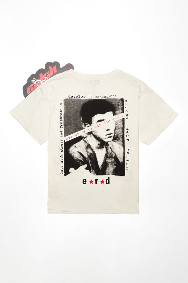 Модель выполнена из премиального хлопка цвета слоновой кости с эффектом лёгкой винтажности. Прямой крой, круглый вырез и грубая обработка швов создают ощущение DIY-ремейка архивной футболки. Каждая деталь — от мятой текстуры до неидеального принта — говорит: "Мне плевать, и это стильно."