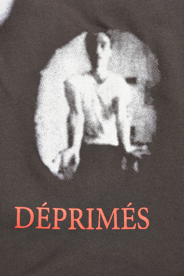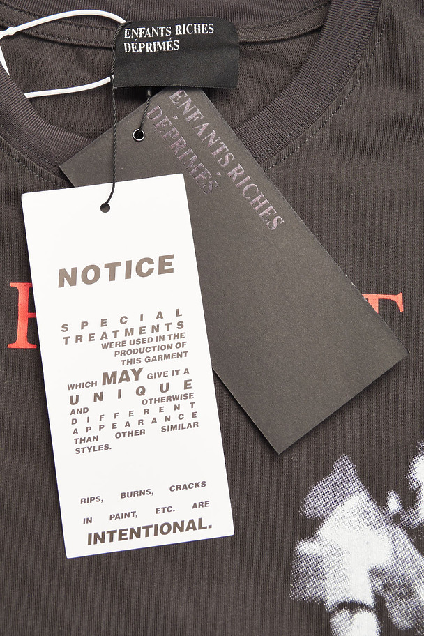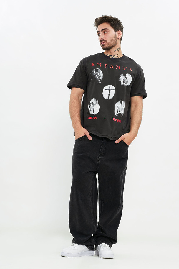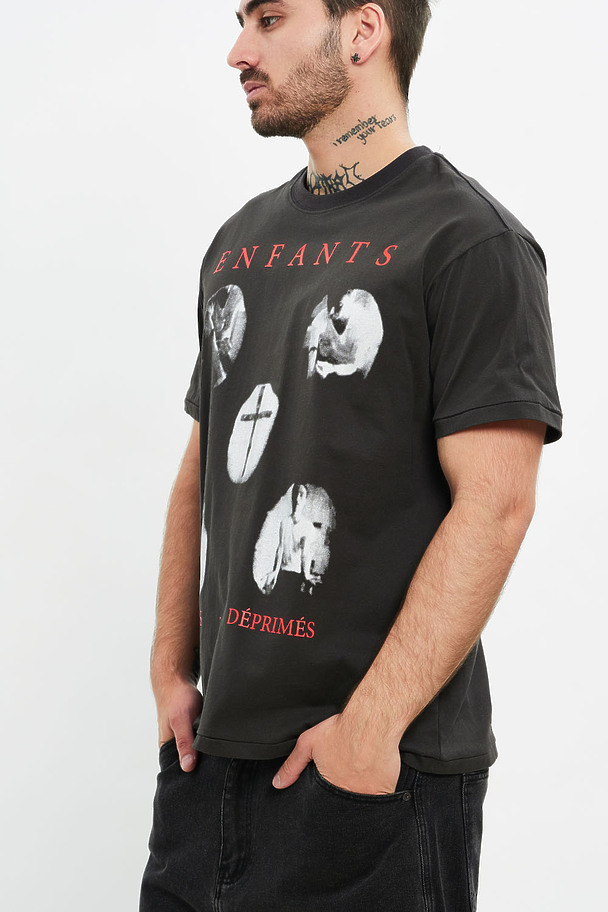 Чёрная футболка Enfants Riches Déprimés оформлена в стиле тёмного арт-романтизма. На груди — коллаж из винтажных чёрно-белых фотографий, объединённых центральным образом — крестом в овальной рамке. Красная надпись ENFANTS RICHES DÉPRIMÉS придаёт композиции тревожную уравновешенность. Всё это работает как визуальный дневник одиночества, религиозного конфликта и внутренней депрессии — фирменный почерк ERD.