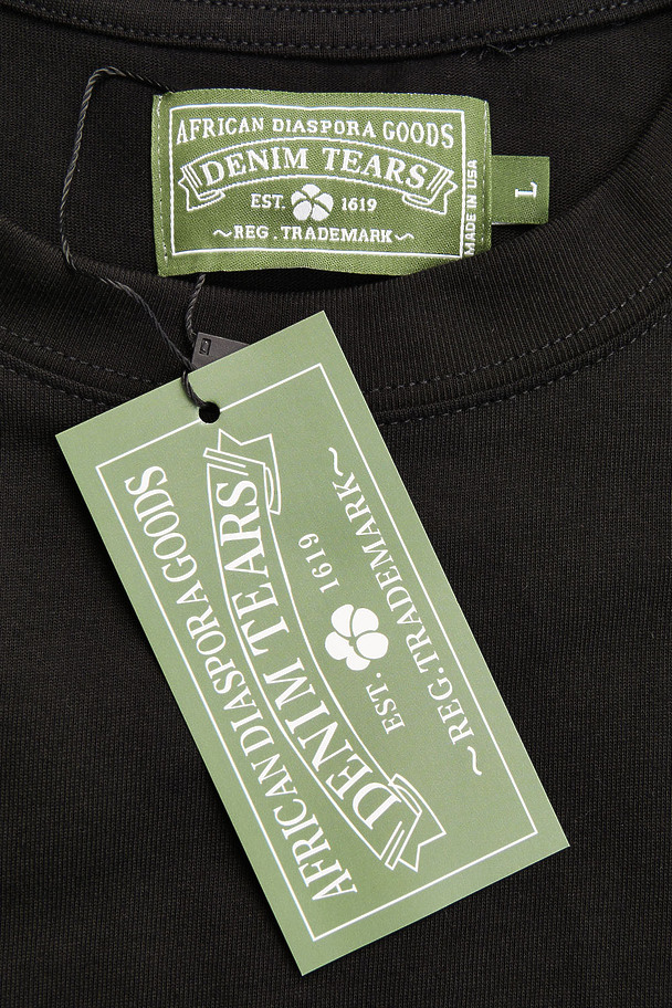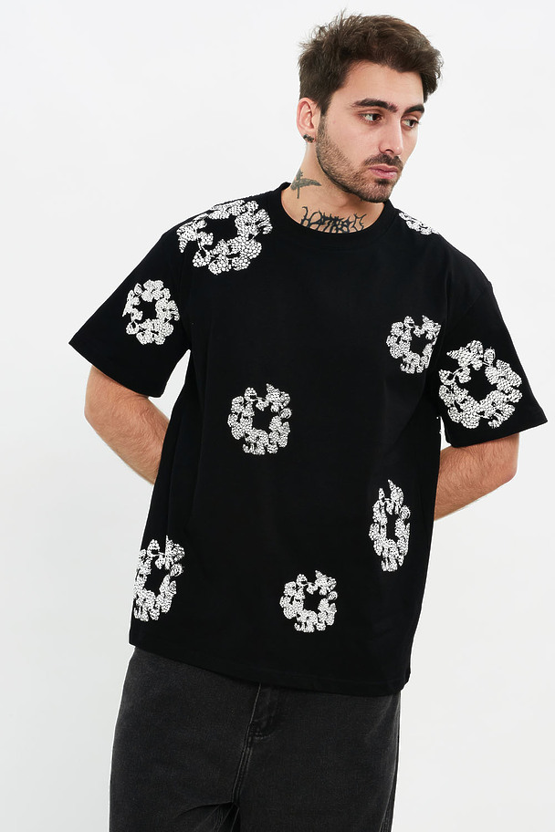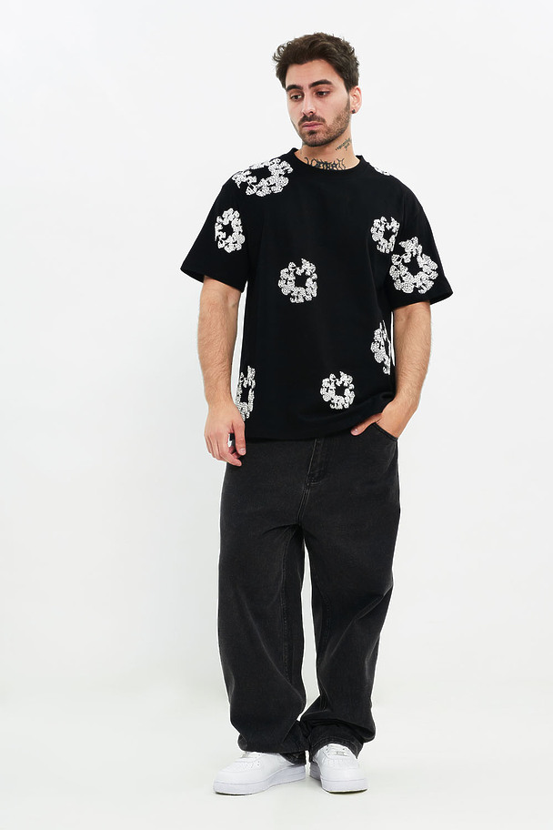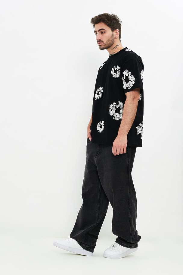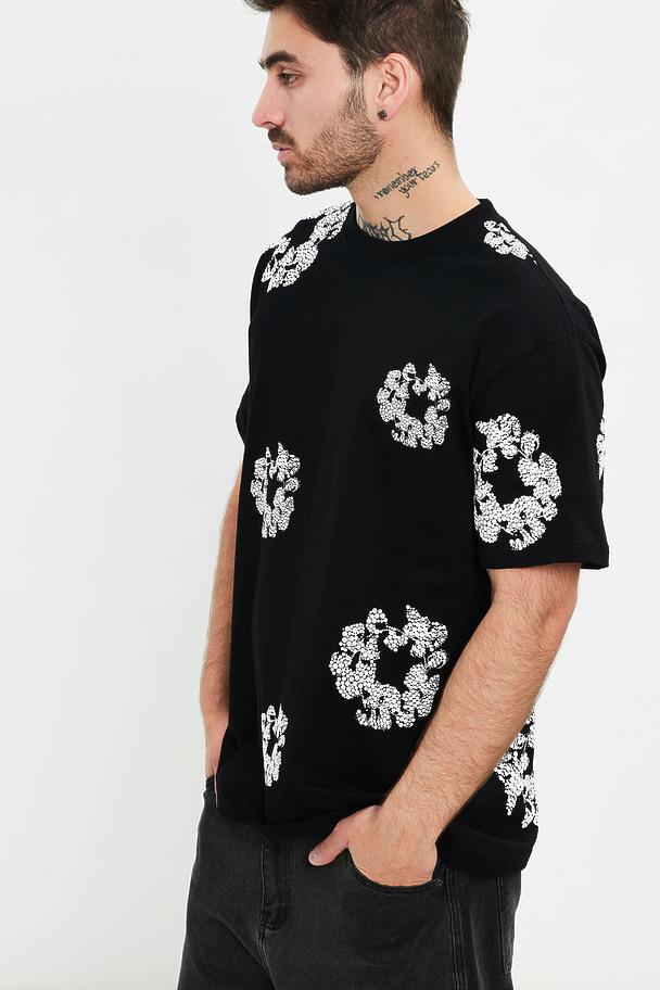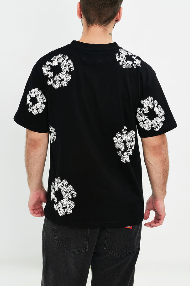 Чёрная футболка Denim Tears украшена узнаваемым графическим паттерном — венками из хлопковых соцветий, выполненными в контрастном белом цвете. Символика бренда отсылает к наследию афроамериканской культуры и теме борьбы за идентичность через моду. Принт покрывает всю поверхность изделия, формируя визуальную динамику и подчёркивая художественный подход бренда.