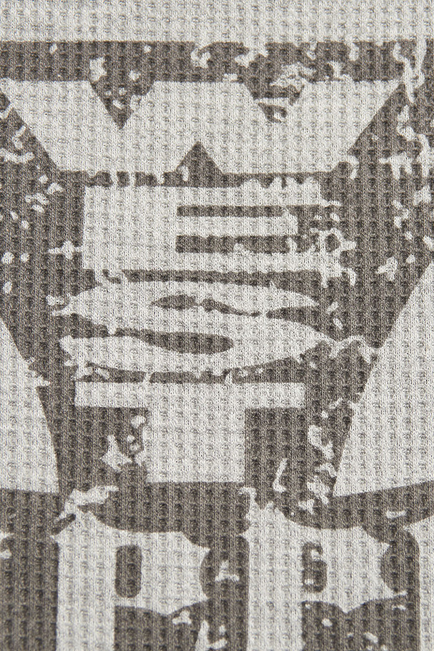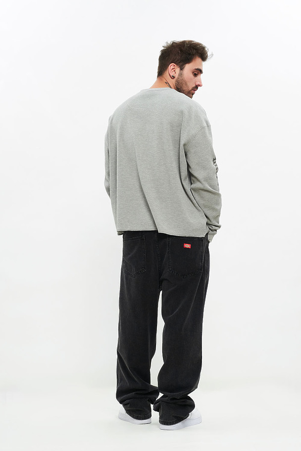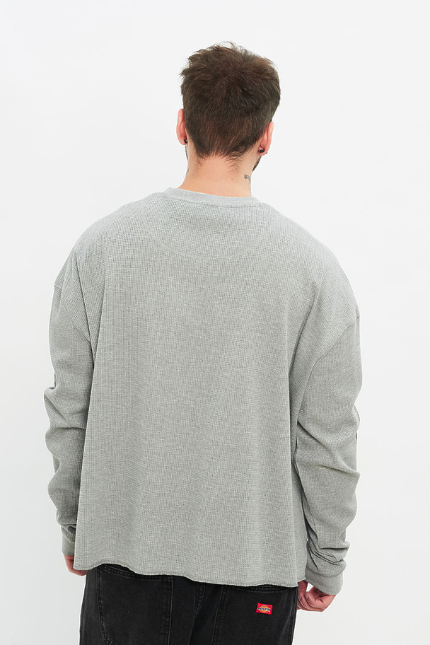 Модель выполнена из тёплого вафельного трикотажа с легкой фактурой, имеет прямой крой с расслабленной посадкой и заниженной линией плеча. Унисекс-дизайн вписывается в луки с дутыми жилетами, кожаными брюками, рваными джинсами и мото-ботами. Стиль — грязный, но честный.