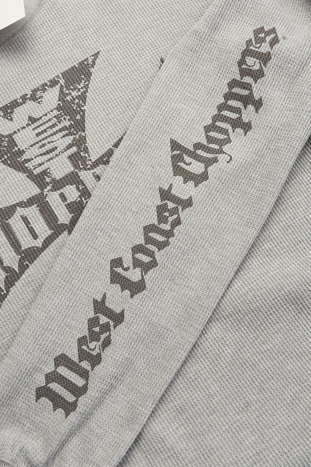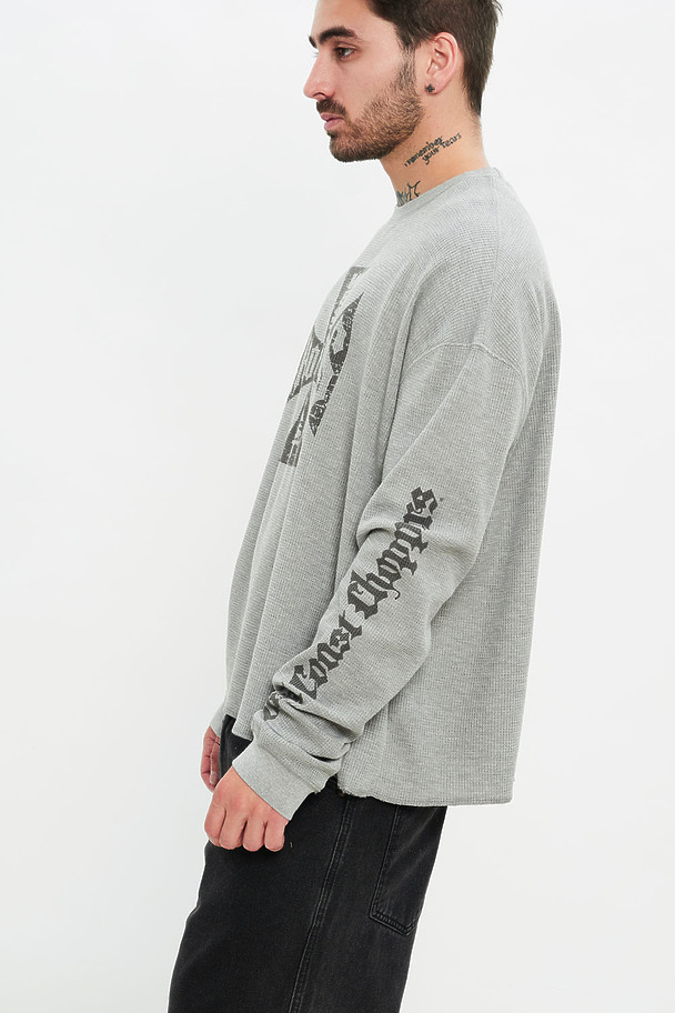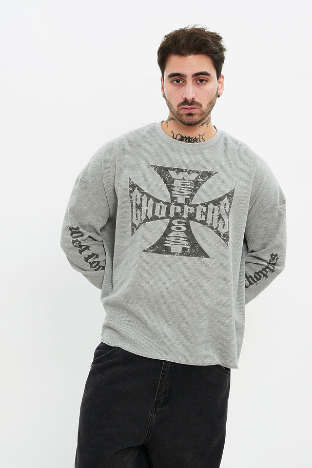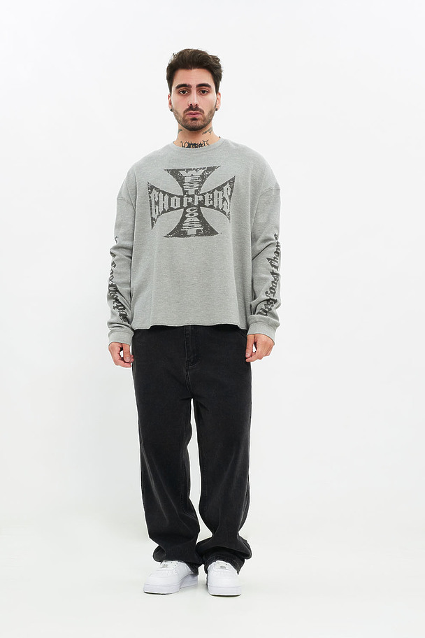 Серый свитшот Enfants Riches Déprimés с графикой в духе байкерской контркультуры — вещь для тех, кто выбирает грязный лоск и визуальный шум вместо глянца. На груди — состаренный принт в виде железного креста с надписью West Coast Choppers, отсылающий к калифорнийскому андерграунду, гаражному року и эстетике outlaw riders. Принт на рукавах продолжает идею восстания против шаблонов.