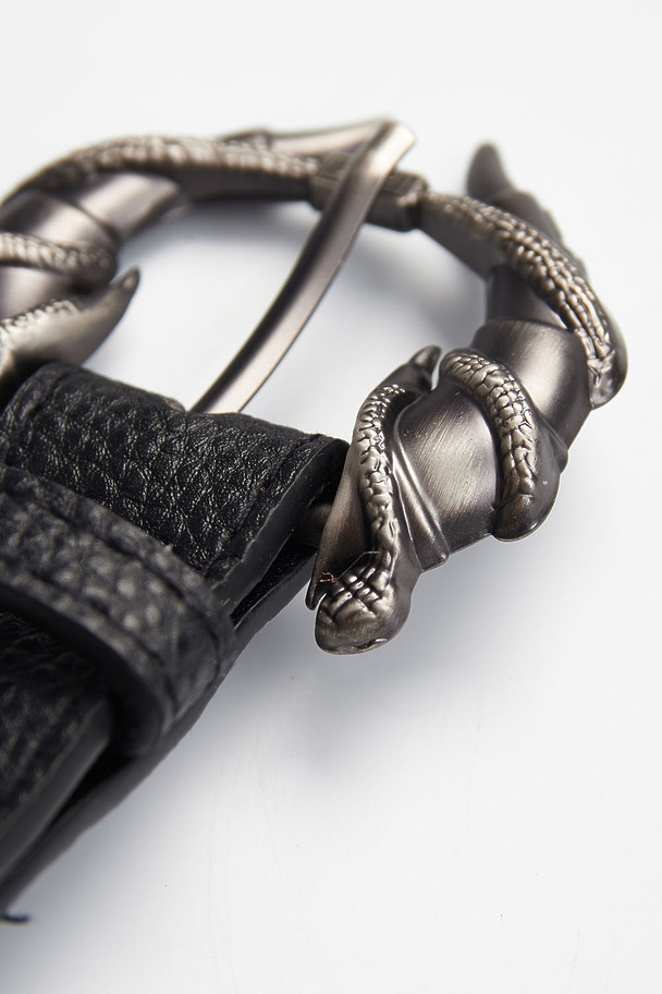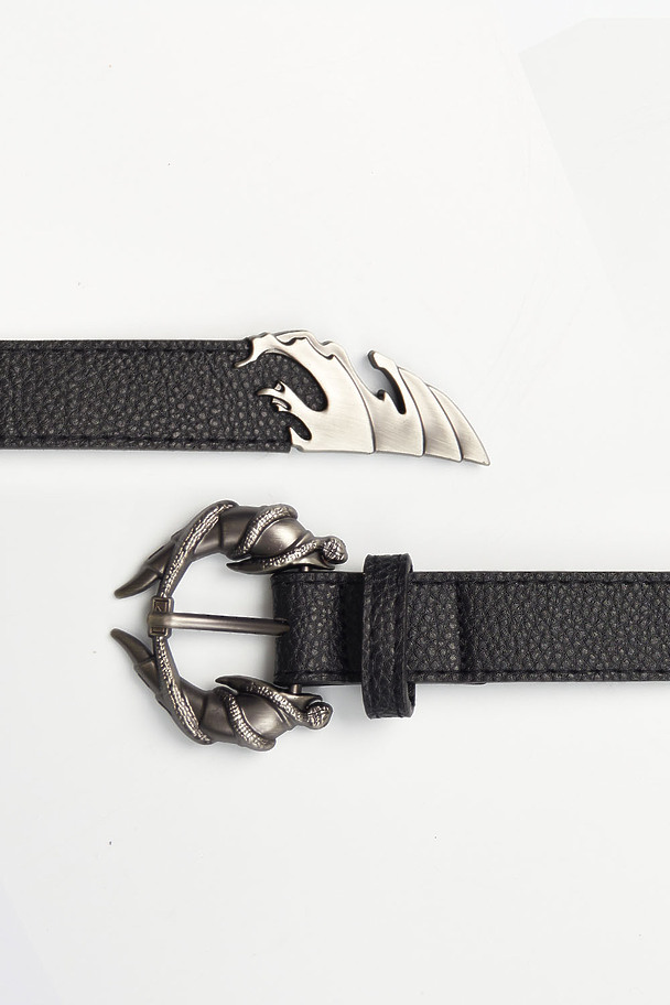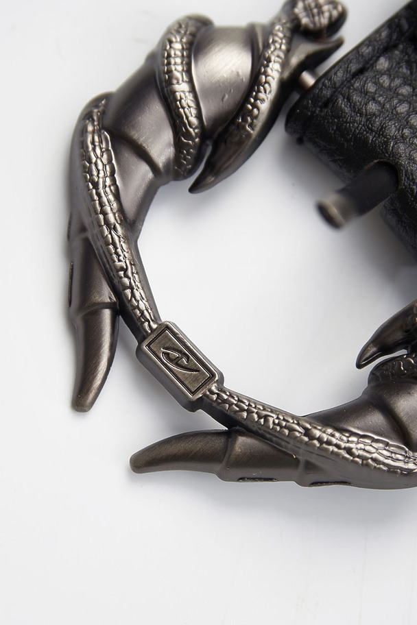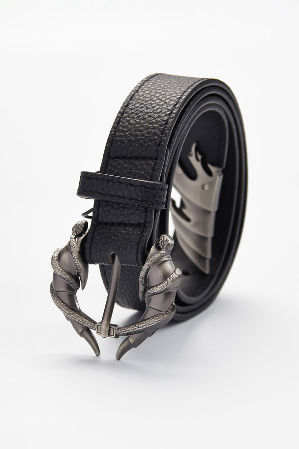 Чёрный ремень Trident — агрессивный аксессуар с выраженной эстетикой techwear и dark fashion. Модель выполнена из текстурированной экокожи с зернистой поверхностью, устойчивой к истиранию и заломам. Основной акцент — на массивной пряжке в форме когтей, обвивающих гарпун, и металлическом наконечнике в виде пламени. Фурнитура с тёмным антик-эффектом подчёркивает индустриальный характер модели.