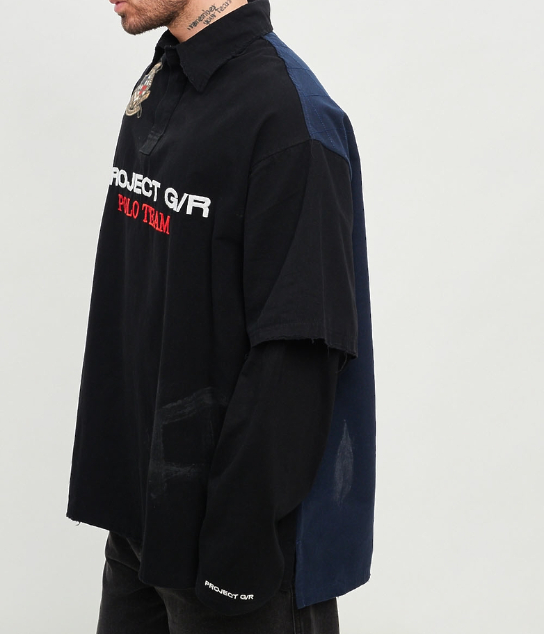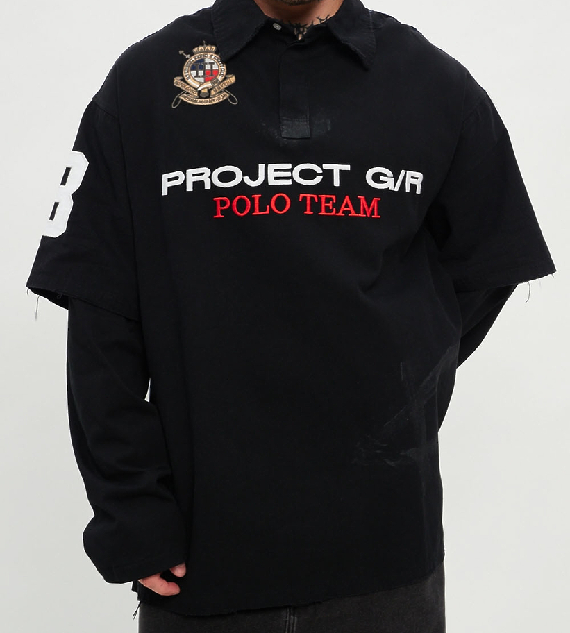 Лонгслив Polo Grailz Project — ироничная деконструкция классического поло, переосмысленного в эстетике уличного нонконформизма. Модель сочетает винтажный спорт с панковской неряшливостью: рубашечный воротник, накладной герб, вышивка PROJECT G/R POLO TEAM и крупная цифра «8» на рукаве отсылают к элитарным видам спорта, но выполнены с подчёркнутым трэшем и raw-отделкой.