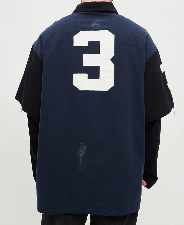 Свободный крой и двухслойная конструкция с удлинёнными рукавами создают эффект наслоения, идеально ложащегося в образы с карго, джинсами, мото-ботами и рваными худи. Футболка-поло превращена в манифест: иронично, громко, дерзко.