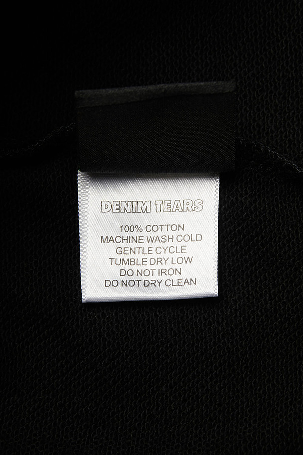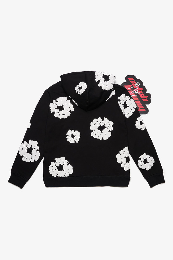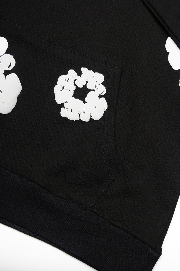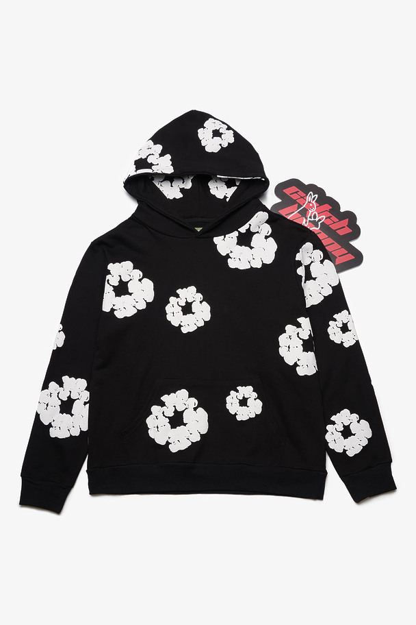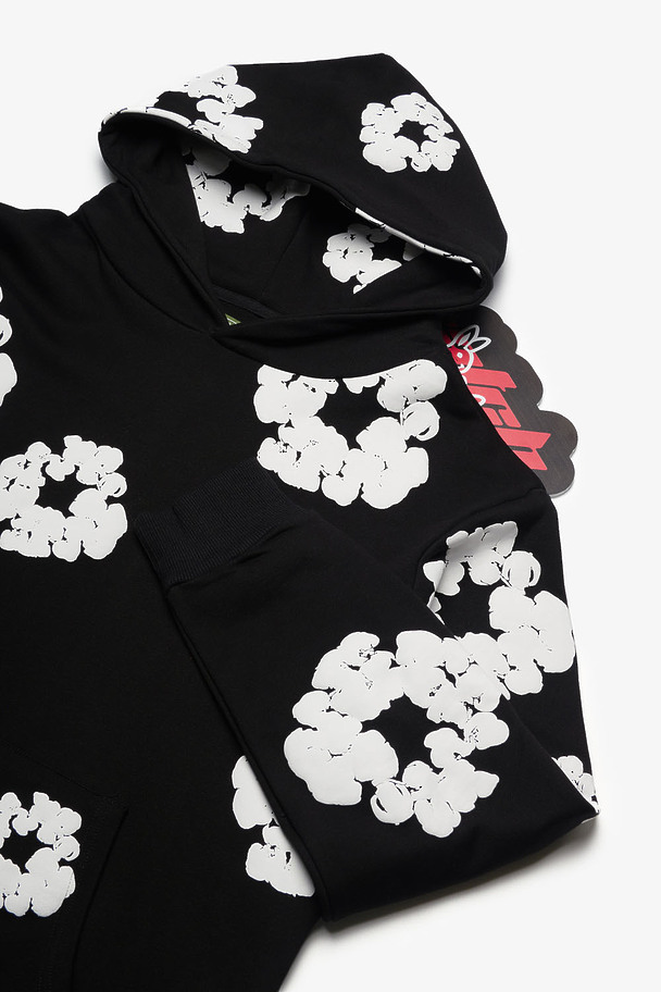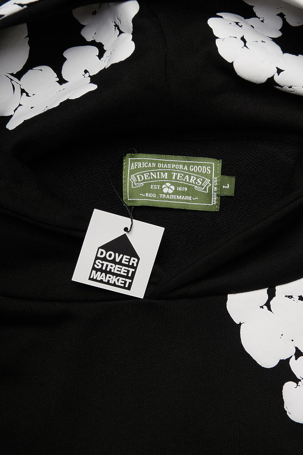 Чёрное худи Denim Tears — это не просто одежда, а культурный символ, зашифрованный в принте. Белые венки из хлопковых соцветий, хаотично разбросанные по всей поверхности, — фирменный мотив бренда, отсылающий к наследию афроамериканской истории и теме освобождения через моду. Контрастный паттерн делает силуэт визуально объёмным, но при этом не перегружает.