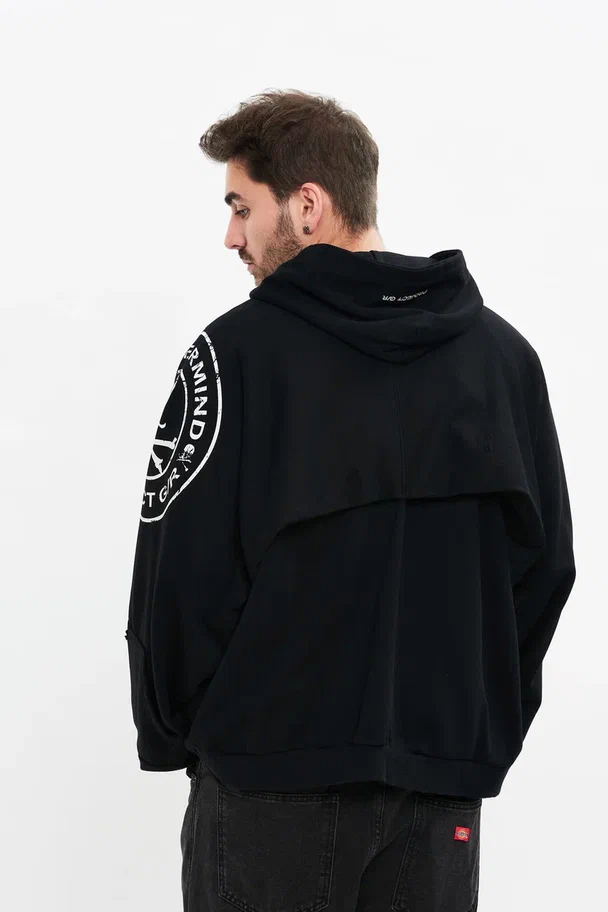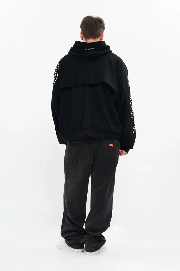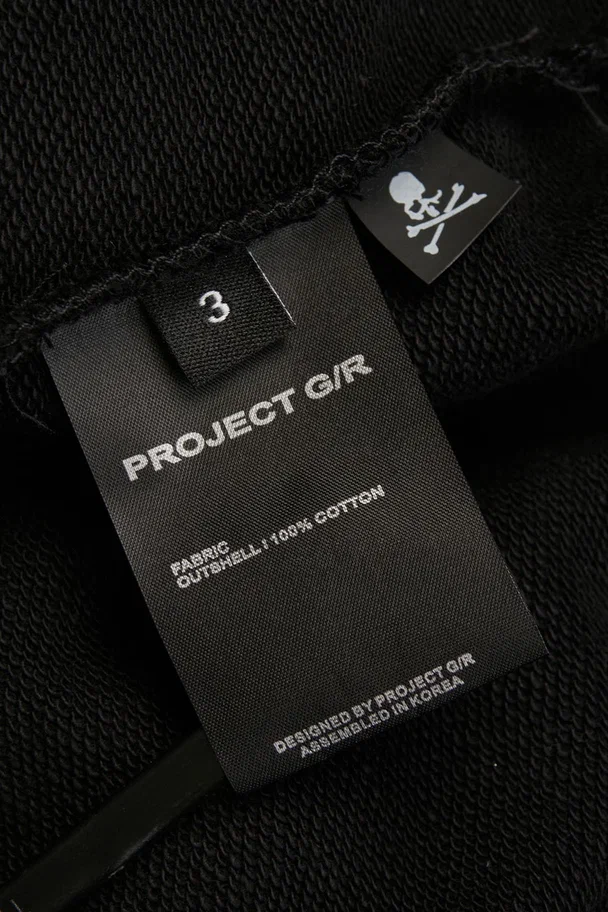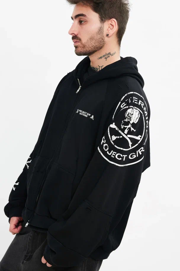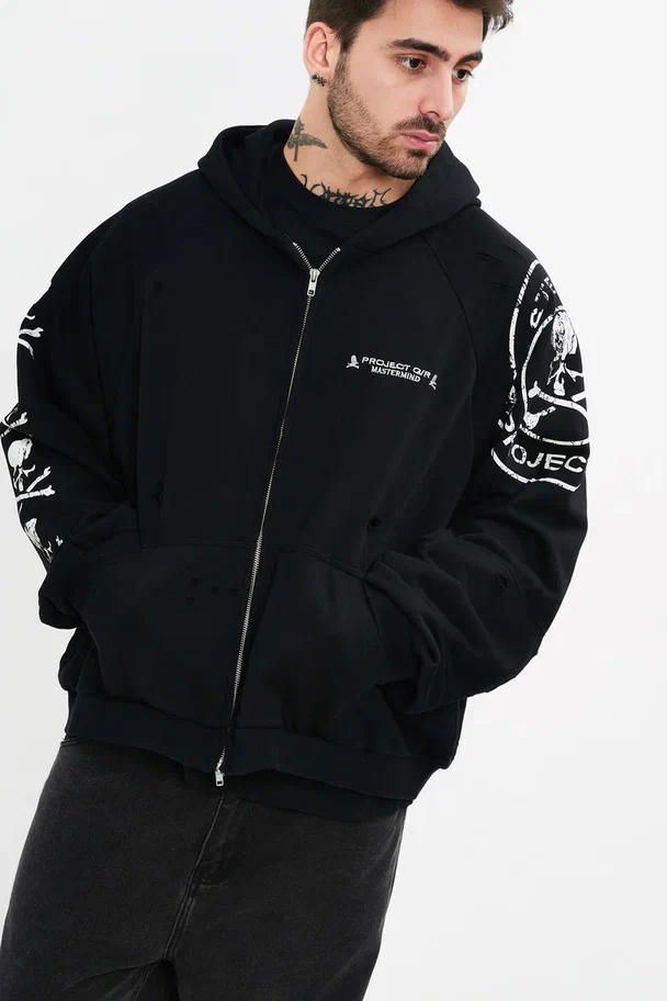 Чёрное зип-худи Project G/R x Mastermind — тёмная классика в современном прочтении. Модель на молнии с капюшоном выполнена из плотного хлопкового футера с лёгким эффектом состаренности и намеренно прорванными деталями. На рукавах — культовые черепа Mastermind, нанесённые с эффектом кракелюра. На груди — логотип Project G/R, подчёркивающий лимитированную коллаборацию.