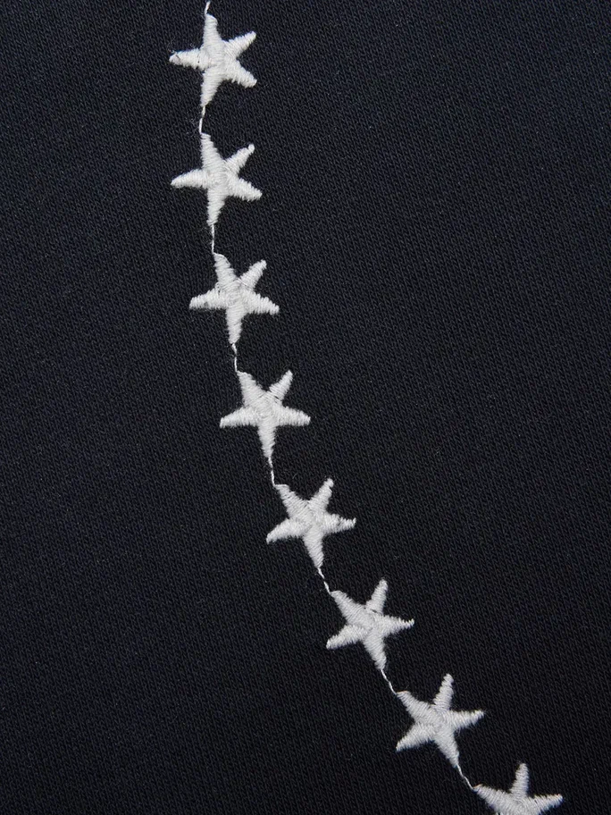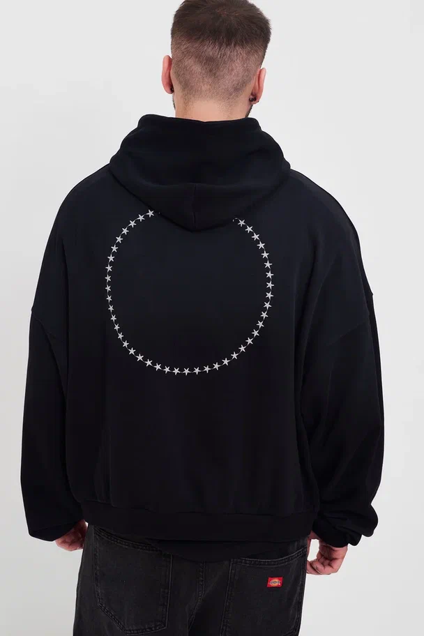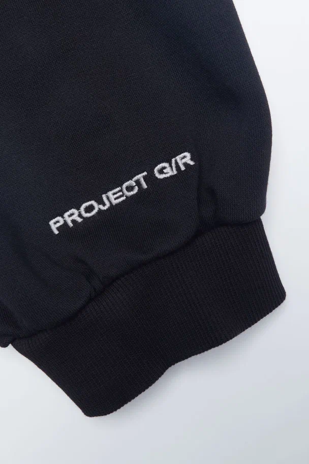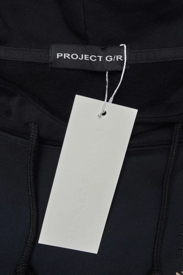 Чёрное зип-худи Project G/R x Mastermind — тёмная классика в современном прочтении. Модель на молнии с капюшоном выполнена из плотного хлопкового футера с лёгким эффектом состаренности и намеренно прорванными деталями. На рукавах — культовые черепа Mastermind, нанесённые с эффектом кракелюра. На груди — логотип Project G/R, подчёркивающий лимитированную коллаборацию.