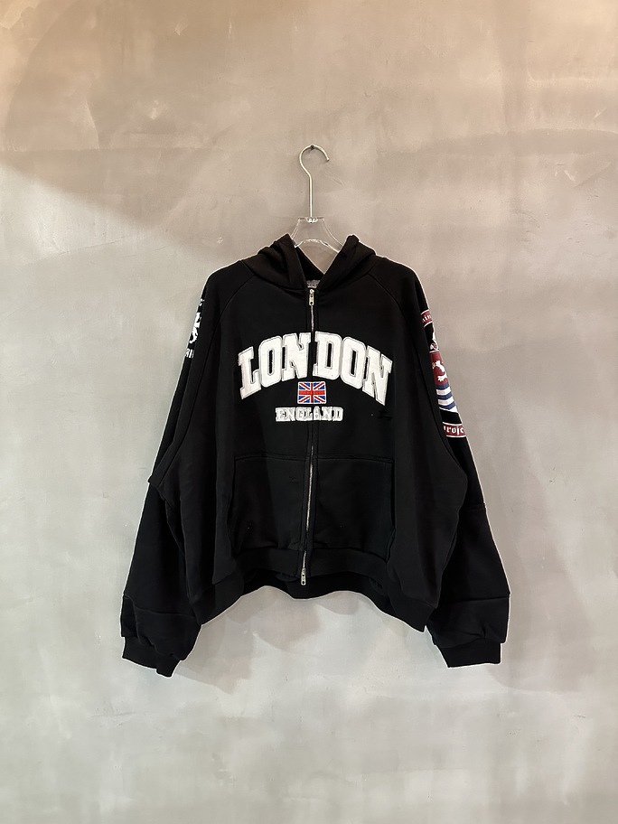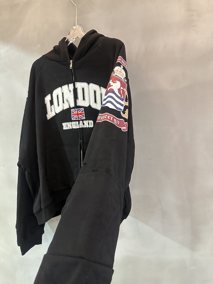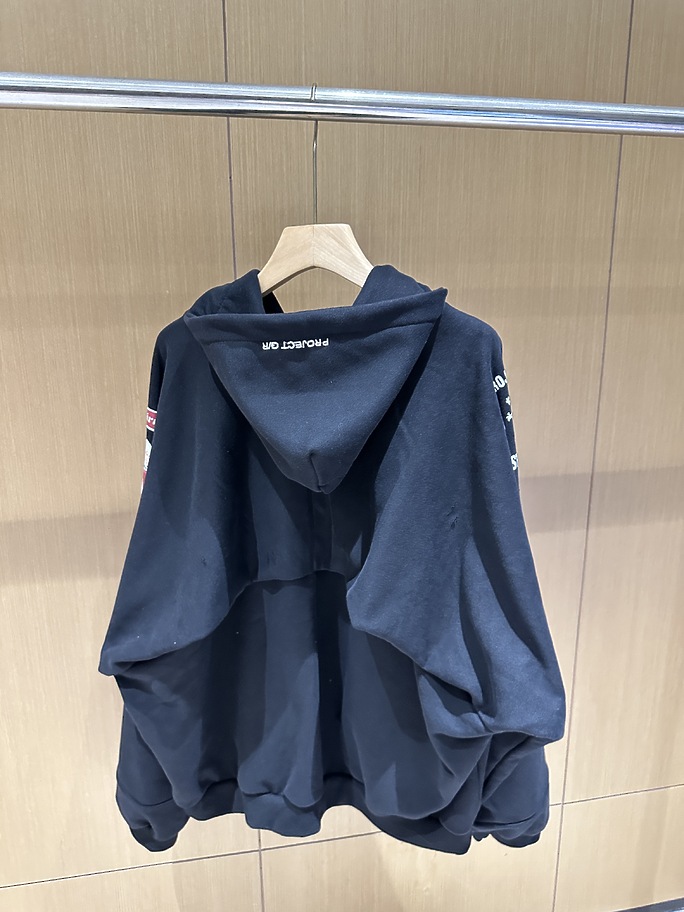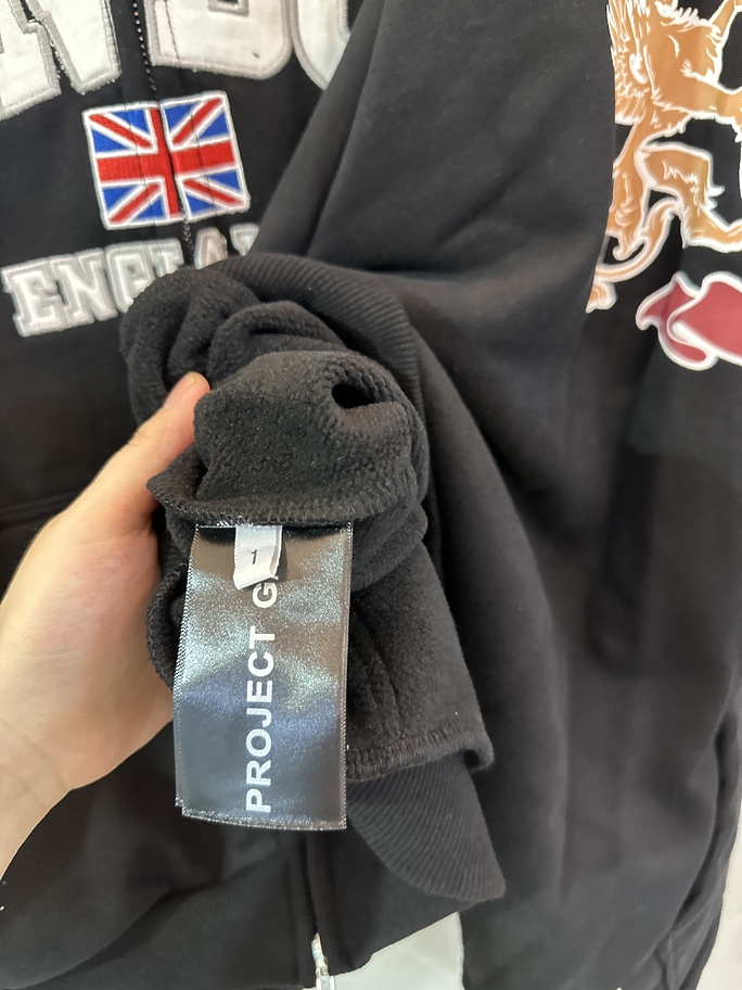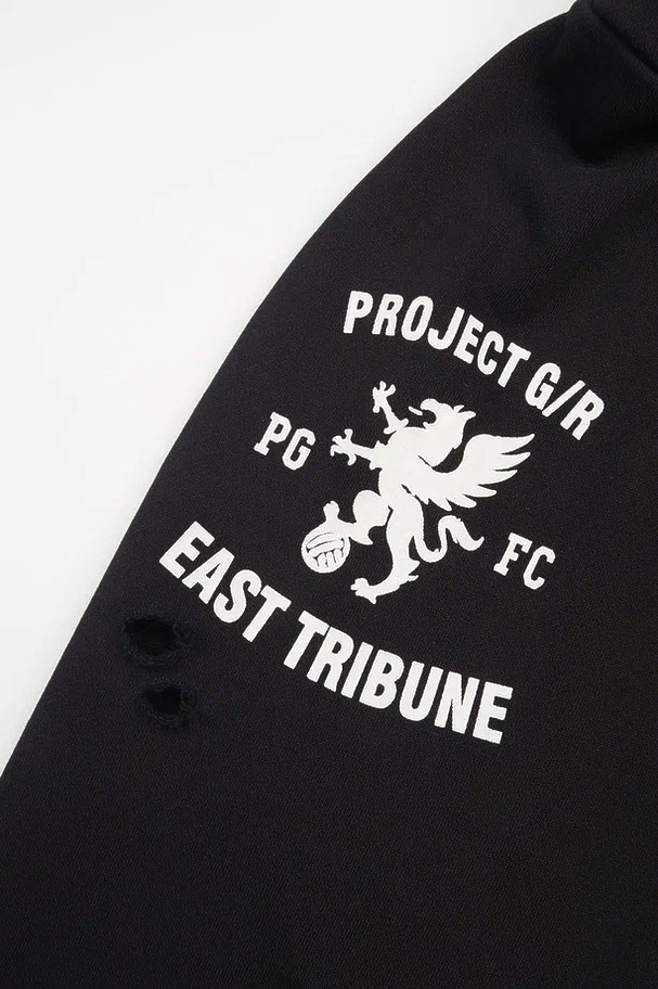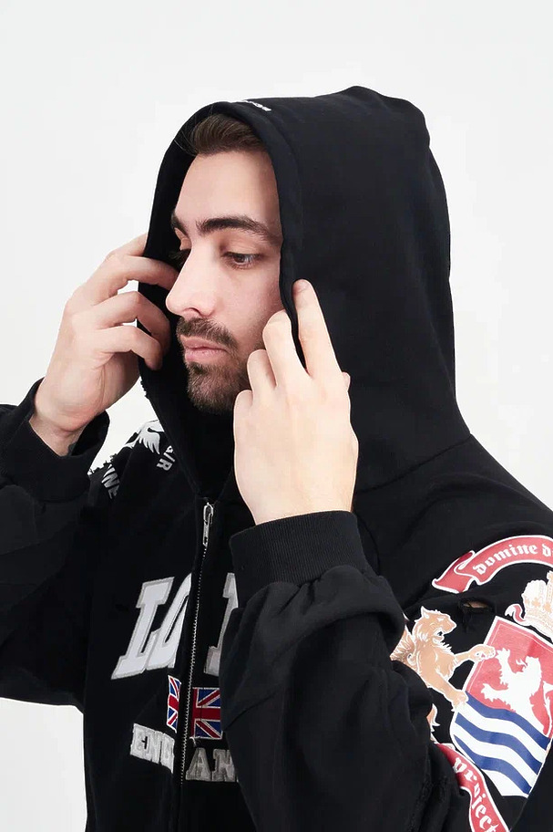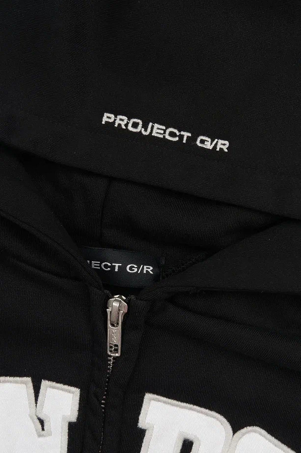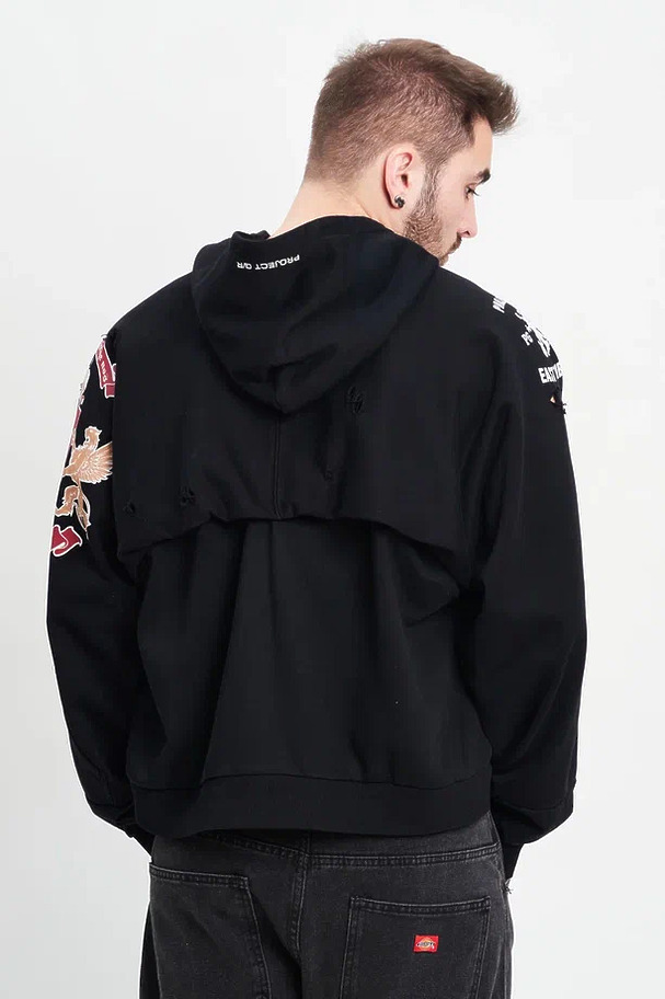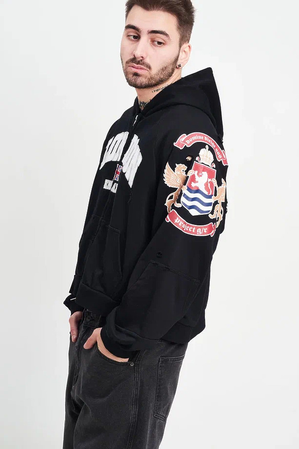 Чёрное зип-худи Project G/R x Mastermind — тёмная классика в современном прочтении. Модель на молнии с капюшоном выполнена из плотного хлопкового футера с лёгким эффектом состаренности и намеренно прорванными деталями. На рукавах — культовые черепа Mastermind, нанесённые с эффектом кракелюра. На груди — логотип Project G/R, подчёркивающий лимитированную коллаборацию.