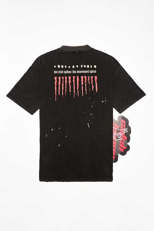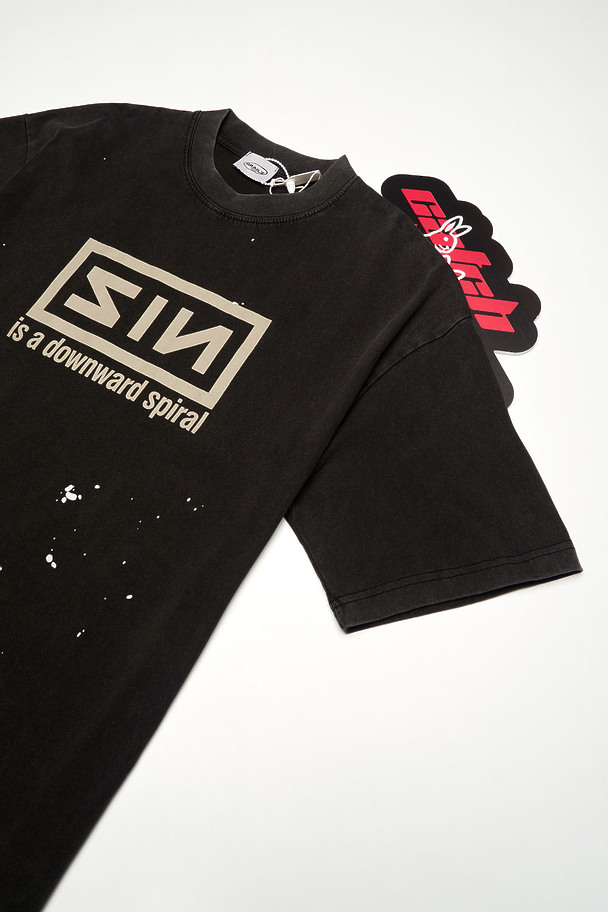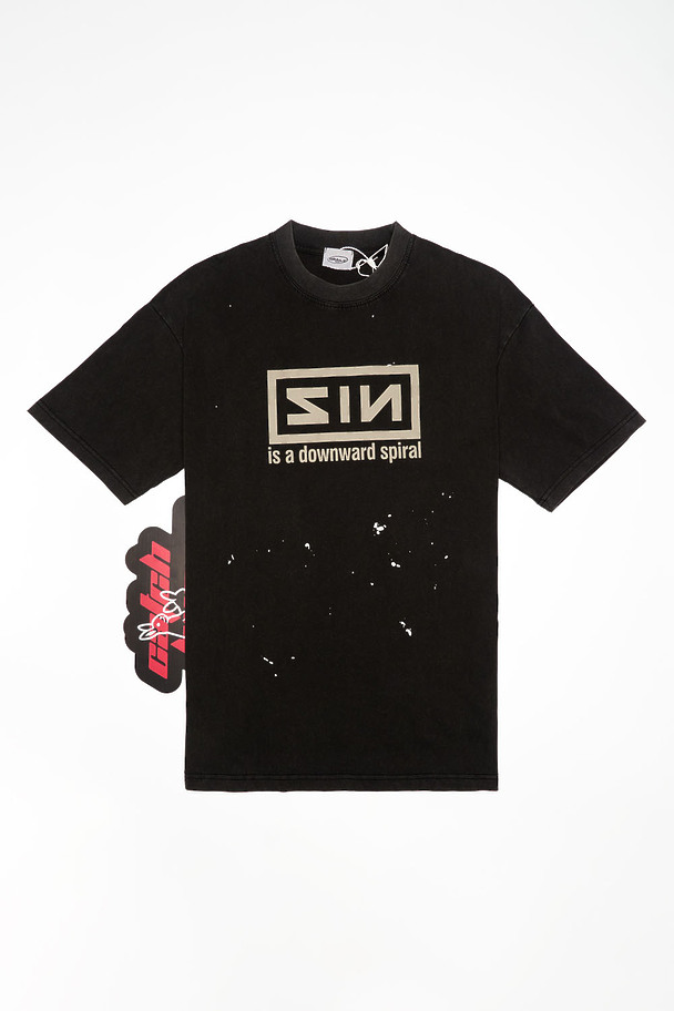 Футболка Grailz Sin чёрного цвета с потёртым эффектом. Хлопок плотный, с матовой поверхностью. Цвет неравномерный, с вываркой в винтажном стиле. Прямой крой, свободная посадка, заниженное плечо. Рукав удлинённый, горловина с плотной окантовкой. Фронт — выразительный принт, прорисовка чёткая, стилизация под кракле. Потёртости по швам, вороту, низу футболки. Детали подчёркивают эстетку гранжа.