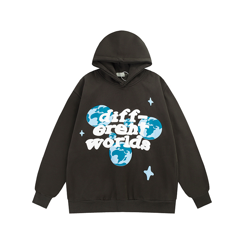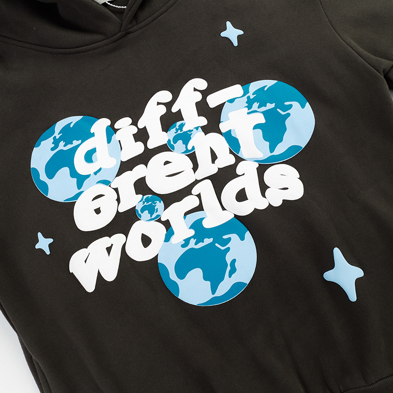 Стильное худи черного цвета с печатью "Миры" бренда Broken Planet