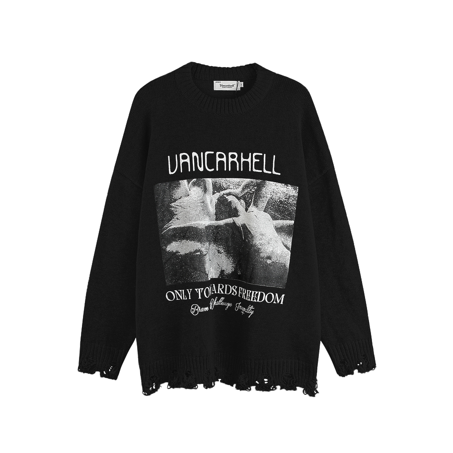 С качественным рисунком и надписями черный свитер бренда VANCARHELL