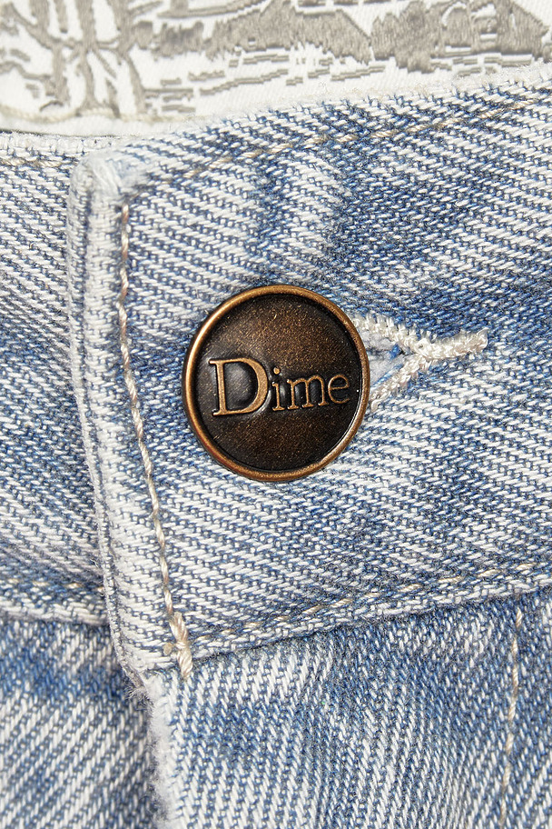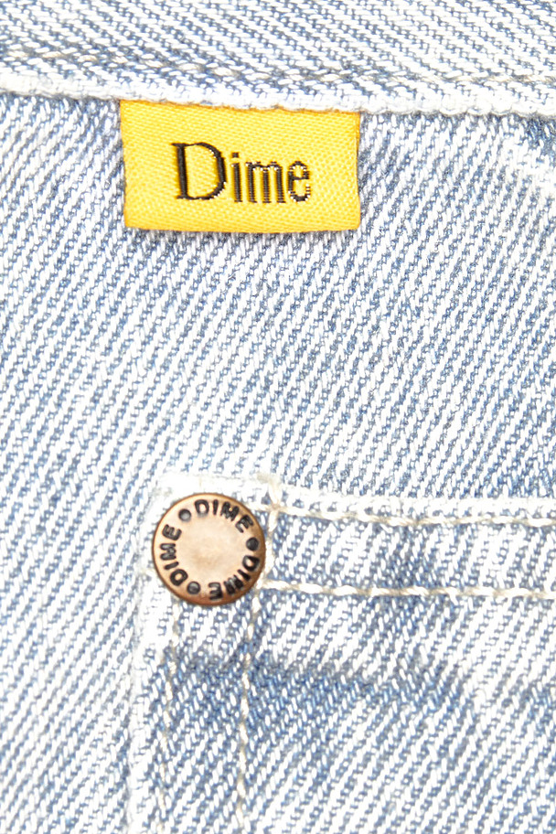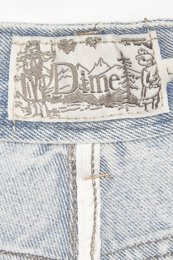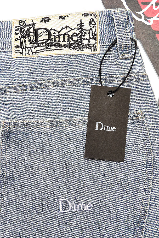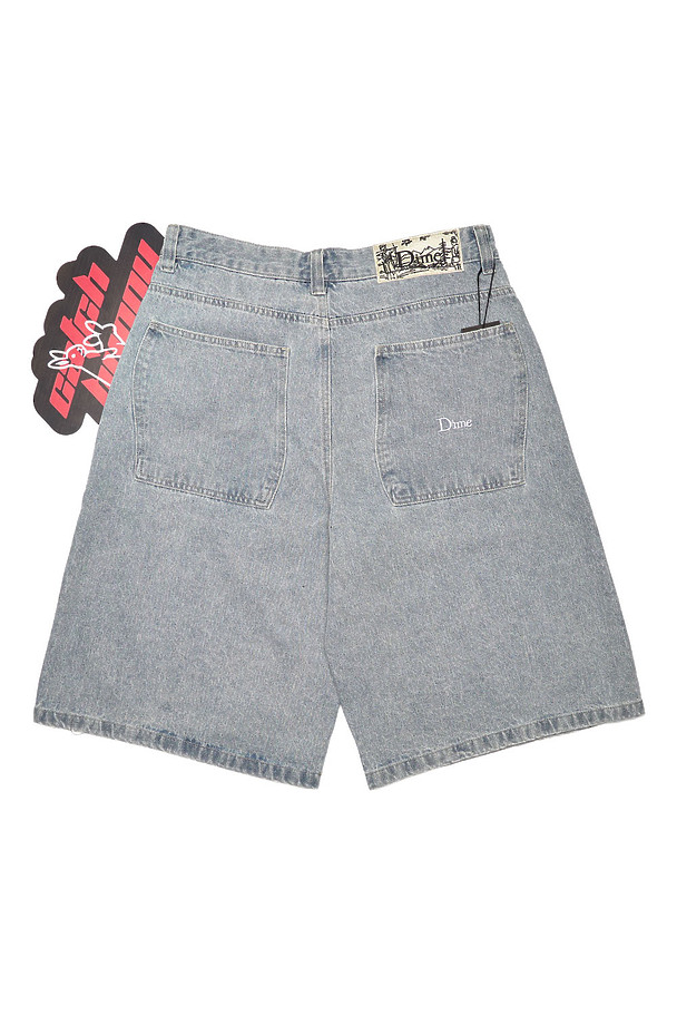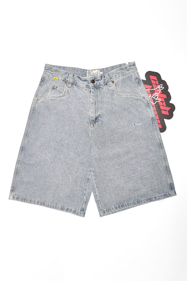 Шорты голубые Dime с вышивкой в наличии — свободная посадка, прямой крой, плотный деним с равномерным оттенком. Ткань гладкая, без грубой фактуры. Цвет свежий, светло-голубой, без выцветаний и разводов. Пояс средней высоты, застёжка на пуговицу и молнию. Пять карманов: два спереди, два сзади и один дополнительный врезной. Вышивка на левой штанине — контрастная, чёткая, без перегибов и смещений.