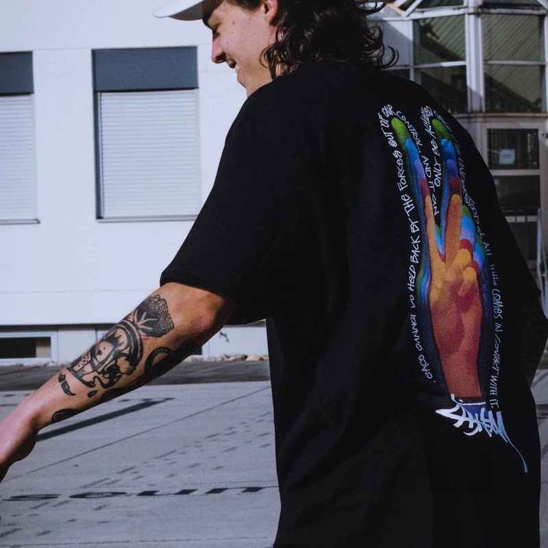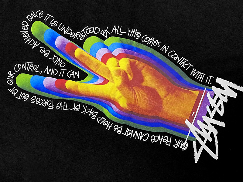 Универсальная черная футболка Stussy с ярким цветным принтом